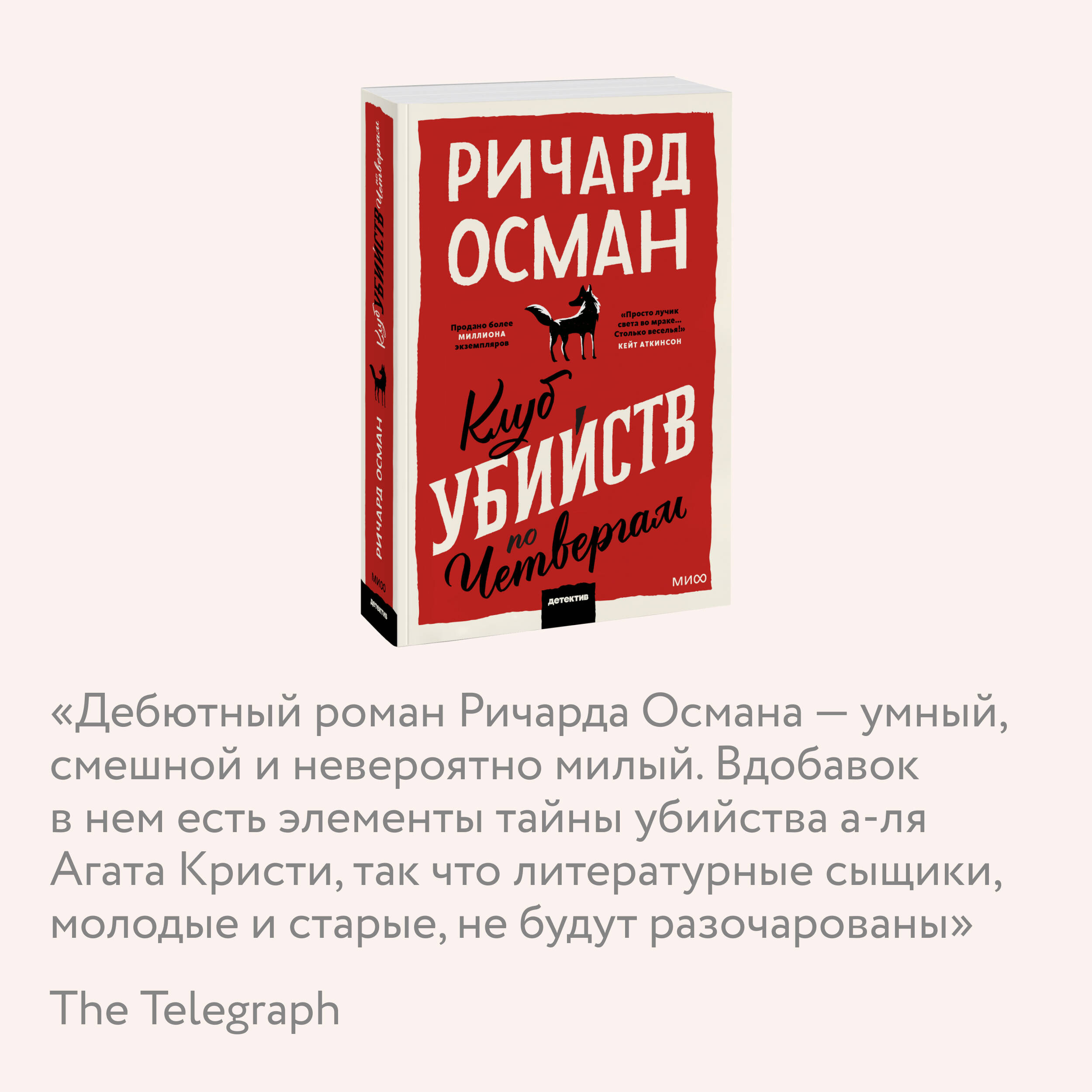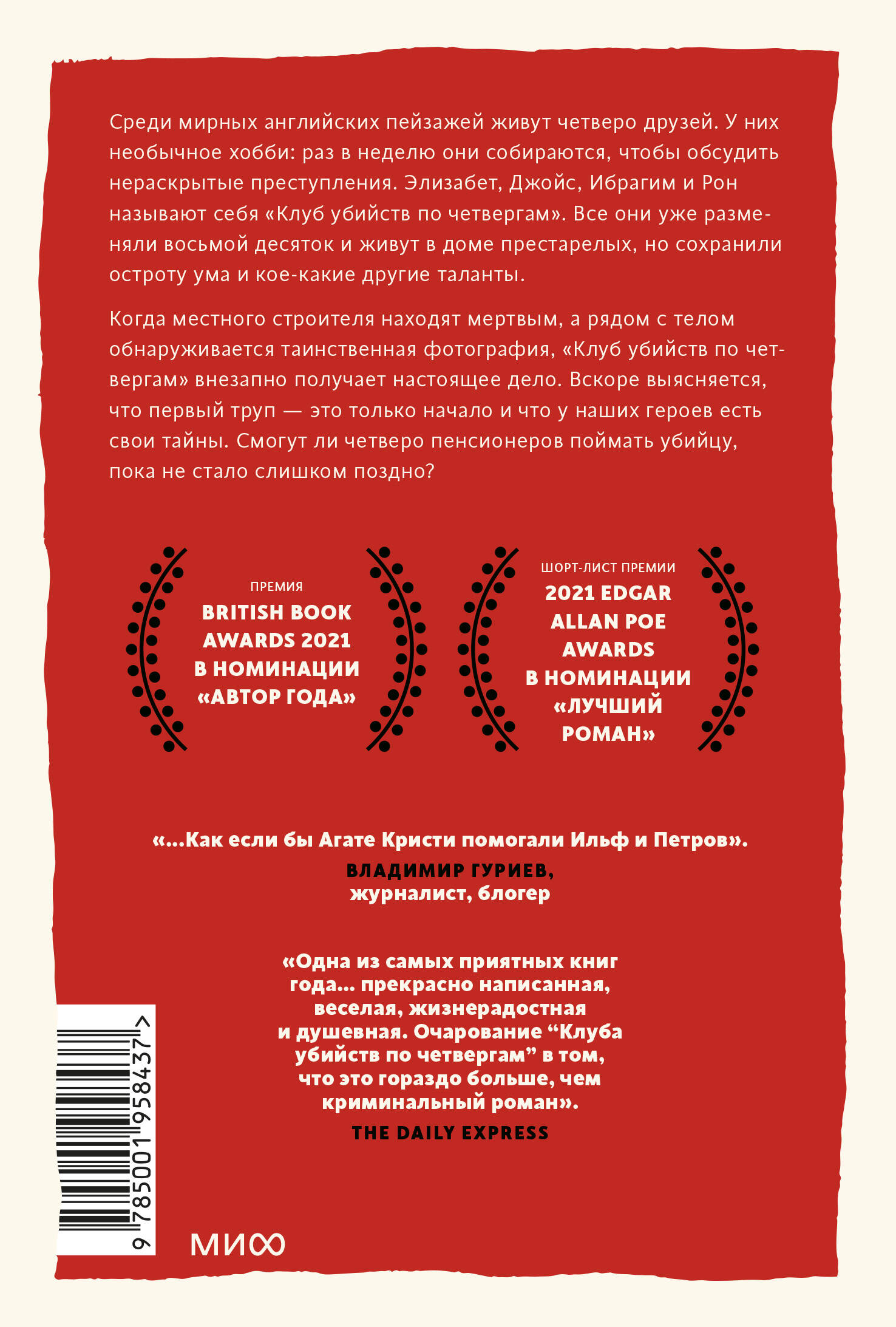 Наш главный бестселлер 2022 года - в формате покетбука. Четверо друзей, разменявших восьмой десяток, берутся за расследование таинственного убийства... В доме престарелых, расположенном среди мирных сельских пейзажей, четверо друзей еженедельно встречаются в комнате для отдыха, чтобы обсудить нераскрытые преступления. Они называют себя Клубом убийств по четвергам. Элизабет, Джойс, Ибрагим и Рон уже разменяли восьмой десяток, но у них все еще есть кое-какие трюки в запасе. Когда местного строителя находят мертвым, а рядом с телом обнаруживается таинственная фотография, Клуб убийств по четвергам внезапно получает первое настоящее дело. Вскоре количество трупов начинает расти. Сможет ли наша необычная команда поймать убийцу, пока не стало слишком поздно? Интересные факты: Самый продаваемый дебютный роман со времен Дж. К. Роулинг. Продано более 3 миллионов книг автора! Самый продаваемый криминальный дебют всех времен. Самый продаваемый роман 2020 года (среди книг в мягком и твердом переплетах). Ричард Осман получил премию British Book Awards в номинации "Автор года". В первые три месяца после выхода книги роман взлетел на седьмую строчку по продажам книг в твердом переплете (за все время в Великобритании). Роман продержался в бестселлерах Sunday Times 13 недель подряд. Права на книгу куплены в 38 странах. По книге готовятся снимать фильм. Ричард Осман готовит к выходу в свет третью книгу серии.| Издательство | МАНН, ИВАНОВ И ФЕРБЕР ООО |