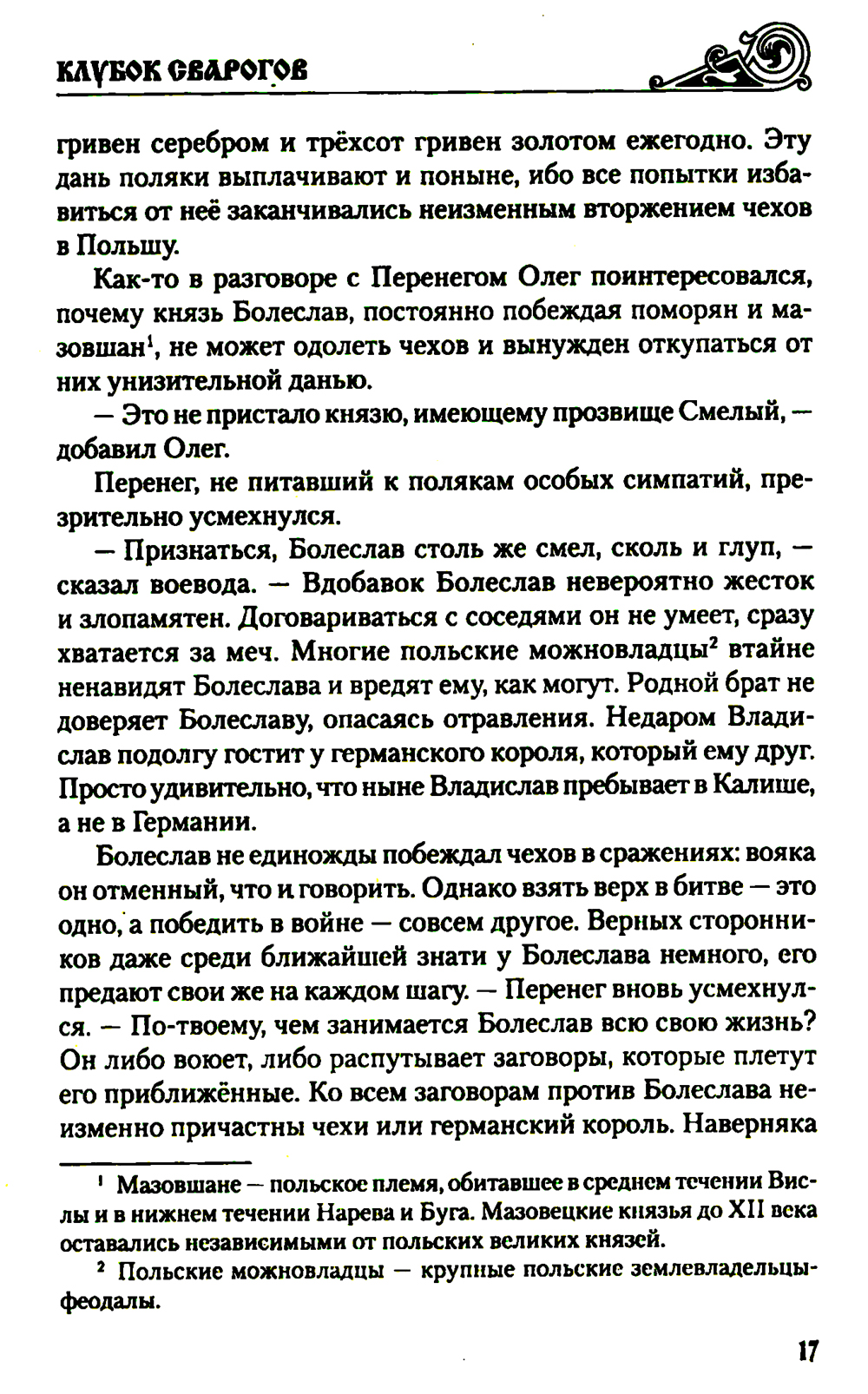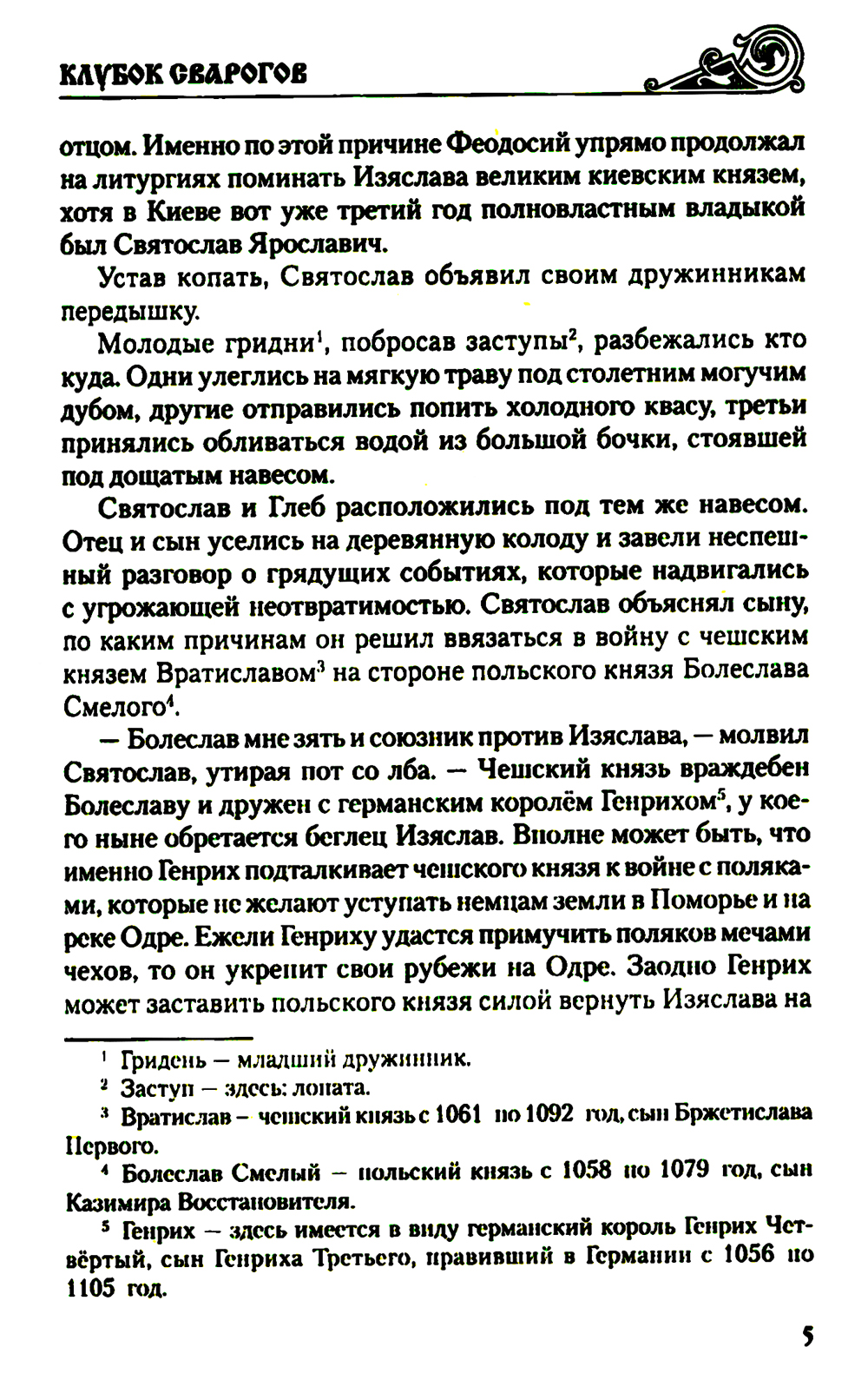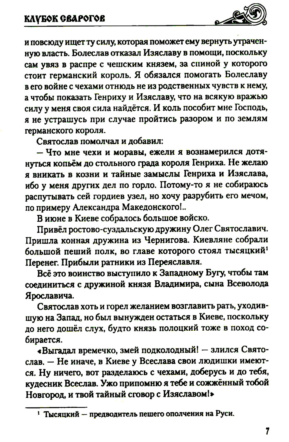 Русь XI века. Тугой клубок противоречий сплёлся по воле Сварога, великого Творца. Трое сыновей покойного Ярослава Мудрого не смогли поладить даже ради собственного блага. Забыли они отцовские слова о том, что сила в единстве. Триумвират братьев распался после того, как старший из них - Изяслав - был вторично изгнан из Киева. На киевский престол сел средний и самый честолюбивый брат - Святослав, но правление его было недолгим. Через три года он умер, а Изяслав вернул себе власть, затаив лютую ненависть к сыновьям покойного брата. Изяслав решил оставить их без уделов, сделать изгоями, и тем самым вынудил начать войну. Можно ли теперь распутать этот клубок Сварогов, не оборвав нить чьей-то жизни? «Клубок Сварогов» является продолжением романа «Братья Ярославичи», ранее опубликованного в этой же серии.