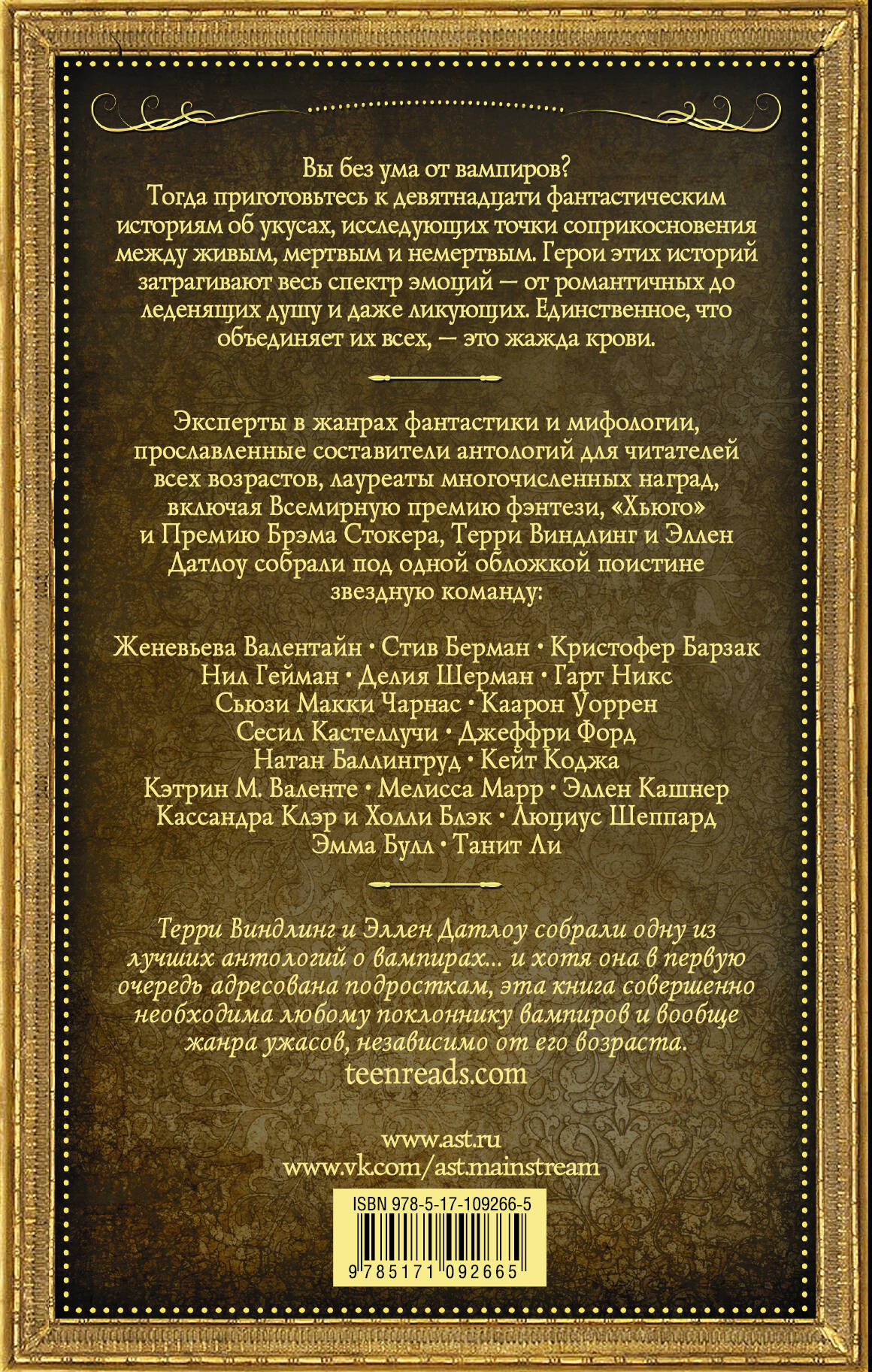 Вы без ума от вампиров? Тогда приготовьтесь к девятнадцати фантастическим историям об укусах, исследующих точки соприкосновения между живым, мертвым и немертвым. Герои этих историй затрагивают весь спектр эмоций - от романтичных до леденящих душу и даже ликующих. Единственное, что объединяет их всех - это жажда крови. Эксперты в жанрах фантастики и мифологии, прославленные составители антологий для читателей всех возрастов, лауреаты многочисленных наград, включая Всемирную премию фэнтези, "Хьюго" и Премию Брэма Стокера, Эллен Датлоу и Терри Виндлинг собрали под одной обложкой поистине звездную команду: Нил Гейман, Кассандра Клэр и Холли Блэк, Мелисса Марр, Кэтрин М. Валенте, Джеффри Форд, Танит Ли и многие другие. Эта книга должна быть на полке у каждого любителя хоррора!| Издательство | Издательство "АСТ" |