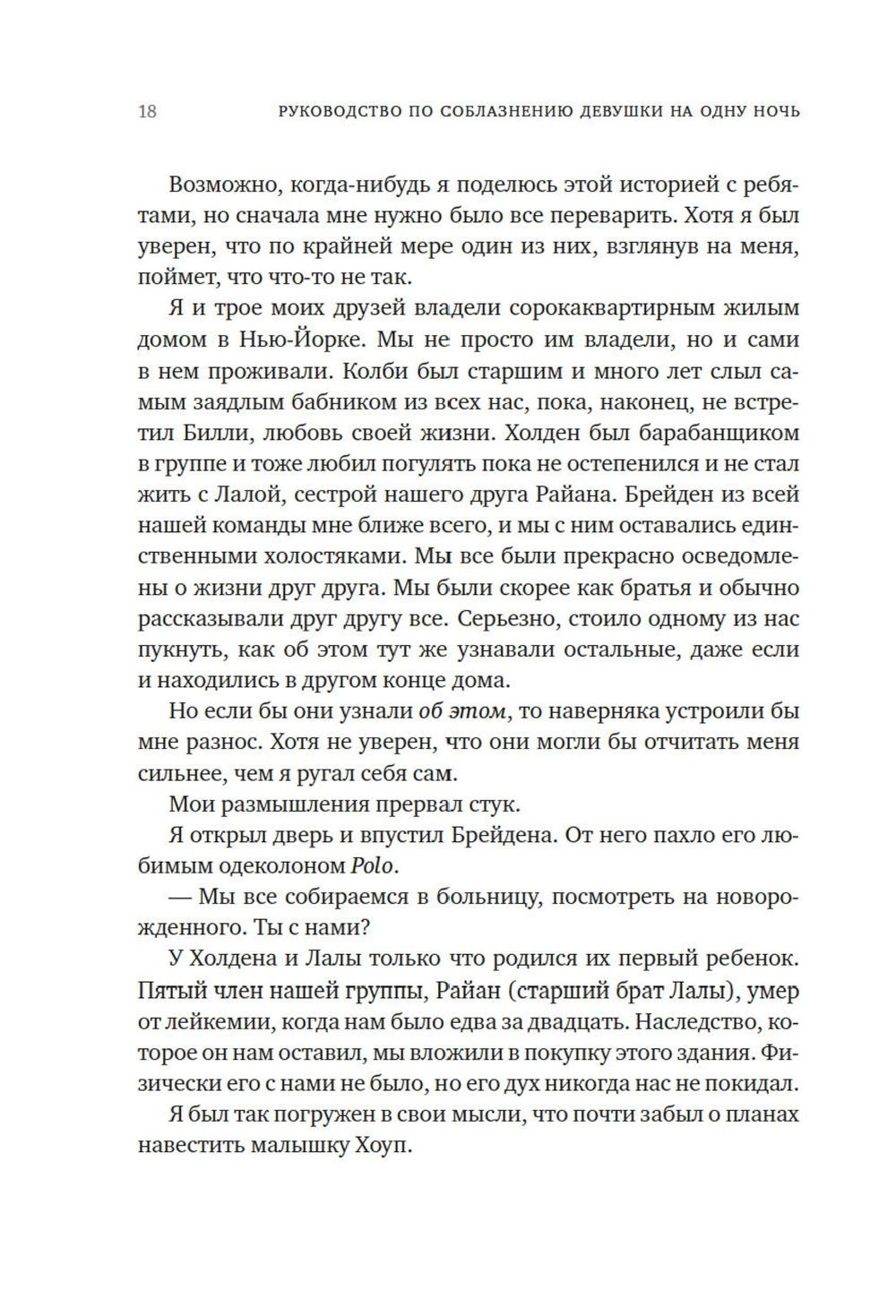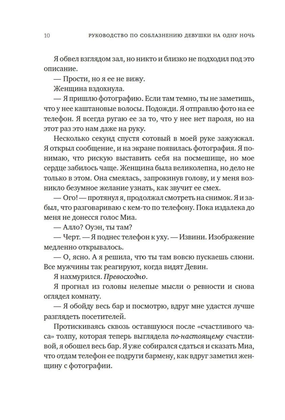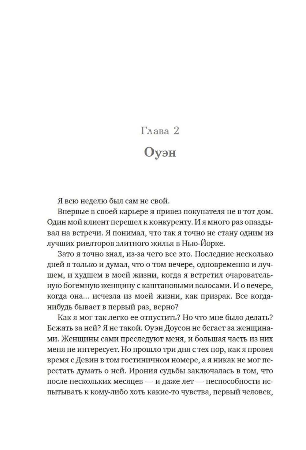 Первое правило хорошего романа на одну ночь: ни в коем случае не влюбляться друг в друга. Но Оуэн понимает, что не может выкинуть Дэвин из головы. После скольких лет одиночества, кажется, наконец ему повстречалась та, что смогла пробудить его интерес. Вот только с наступлением утра она исчезла без следа, и как теперь ее искать? Но если это судьба, то она сама стучит в дверь - или, скорее, Оуэн стучит в одну из сдающихся в его доме квартир, чтобы оповестить жильцов о скором выселении за неуплату. Представьте себе его удивление, когда на пороге оказывается Дэвин. Прекрасная, восхитительная, сложная Дэвин с ворохом собственных проблем и страхов. Дэвин, которая отнюдь не торопится сближаться. Но прежде ни одна женщина еще не казалось Оуэну насколько интересной, и он готов пойти на все, чтобы добиться ее любви.| Издательство | Азбука |