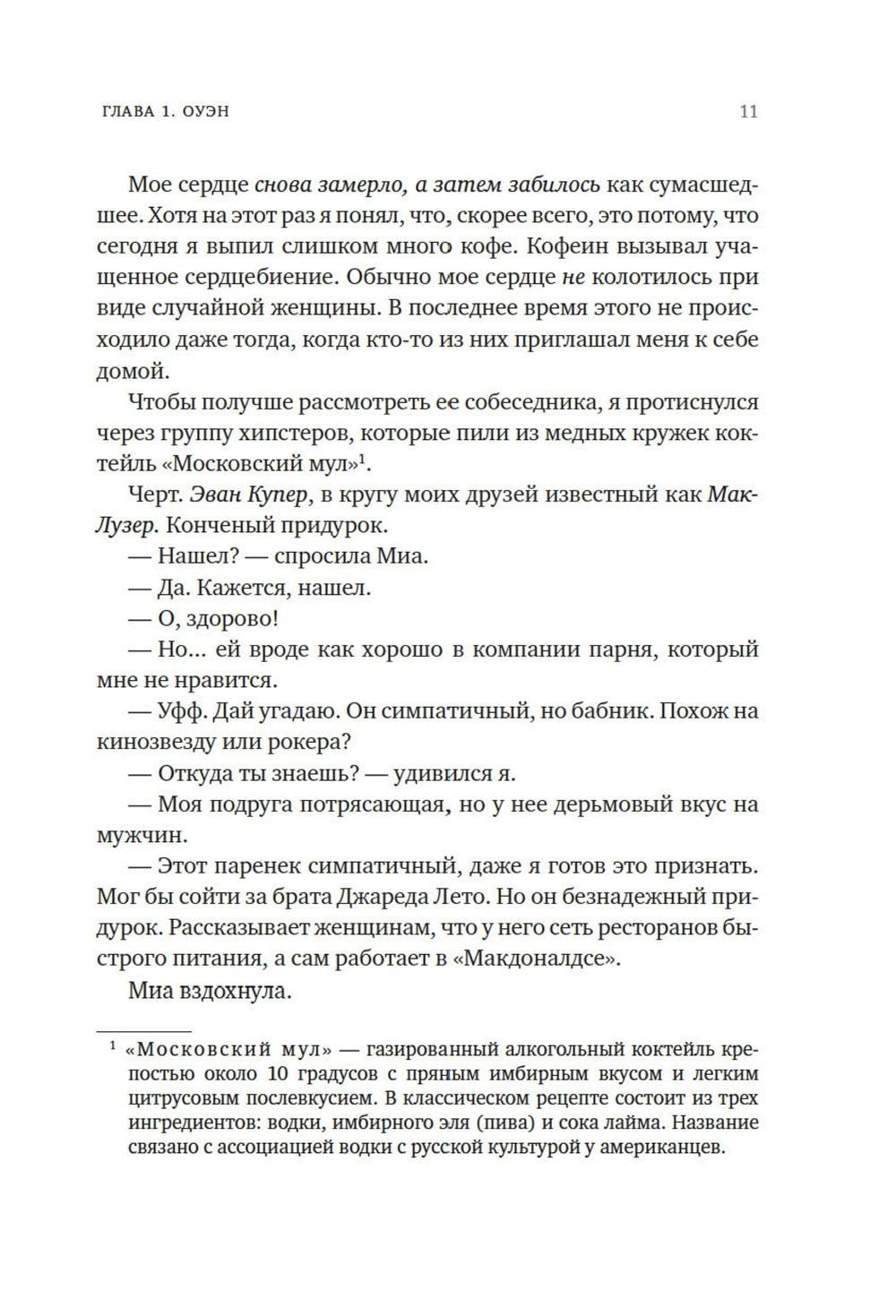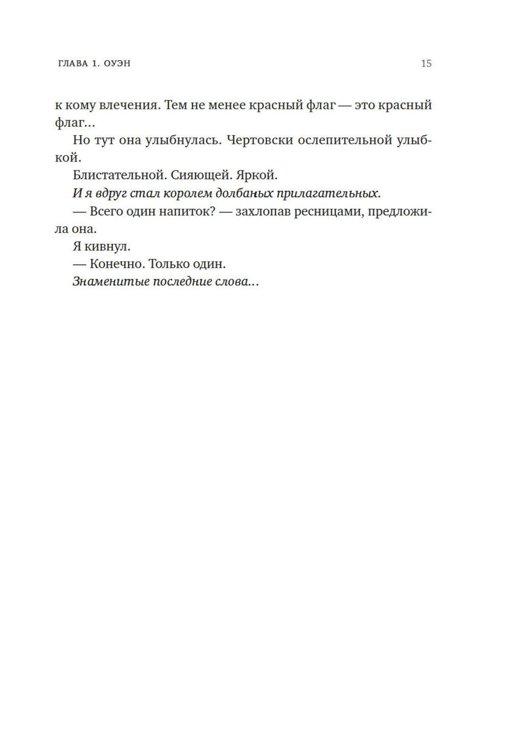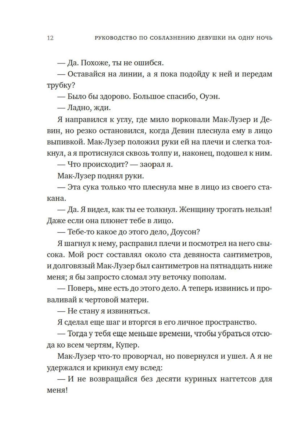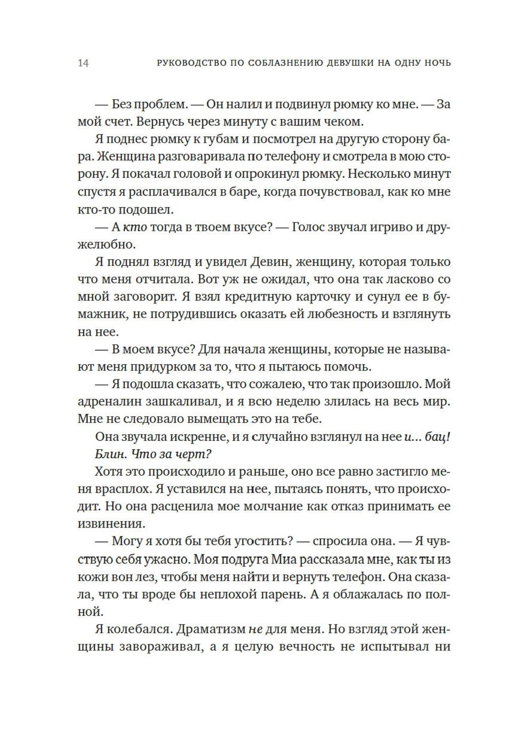 Первое правило хорошего романа на одну ночь: ни в коем случае не влюбляться друг в друга. Но Оуэн понимает, что не может выкинуть Дэвин из головы. После скольких лет одиночества, кажется, наконец ему повстречалась та, что смогла пробудить его интерес. Вот только с наступлением утра она исчезла без следа, и как теперь ее искать? Но если это судьба, то она сама стучит в дверь - или, скорее, Оуэн стучит в одну из сдающихся в его доме квартир, чтобы оповестить жильцов о скором выселении за неуплату. Представьте себе его удивление, когда на пороге оказывается Дэвин. Прекрасная, восхитительная, сложная Дэвин с ворохом собственных проблем и страхов. Дэвин, которая отнюдь не торопится сближаться. Но прежде ни одна женщина еще не казалось Оуэну насколько интересной, и он готов пойти на все, чтобы добиться ее любви.| Издательство | Азбука |