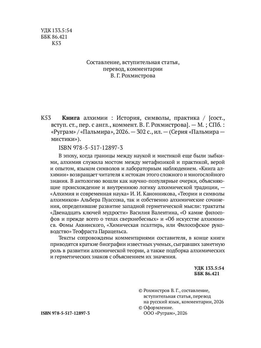 В эпоху, когда границы между наукой и мистикой еще были зыбкими, алхимия служила мостом между метафизикой и практикой, верой и опытом, языком символов и лабораторным наблюдением. «Книга алхимии» возвращает читателя к истокам этого сложного и многослойного знания. В антологию вошли как научно-популярные очерки, объясняющие происхождение и внутреннюю логику алхимической традиции, - «Алхимия и современная наука» И. И. Канонникова, «Теории и символы алхимиков» Альбера Пуассона, так и собственно алхимические сочинения, определившие развитие западной герметической мысли: трактаты «Двенадцать ключей мудрости» Василия Валентина, «О камне философов и прежде всего о телах сверхнебесных» и «Об искусстве алхимии» св. Фомы Аквинского, «Химическая псалтирь, или Философское руководство» Теофраста Парацельса. Тексты сопровождены комментариями составителя, в конце книги приводятся краткие биографии известных ученых, сыгравших заметную роль в развитии алхимической теории, а также подборка алхимических и герметических знаков с объяснением их значения.| Издательство | Т8 RUGRAM |