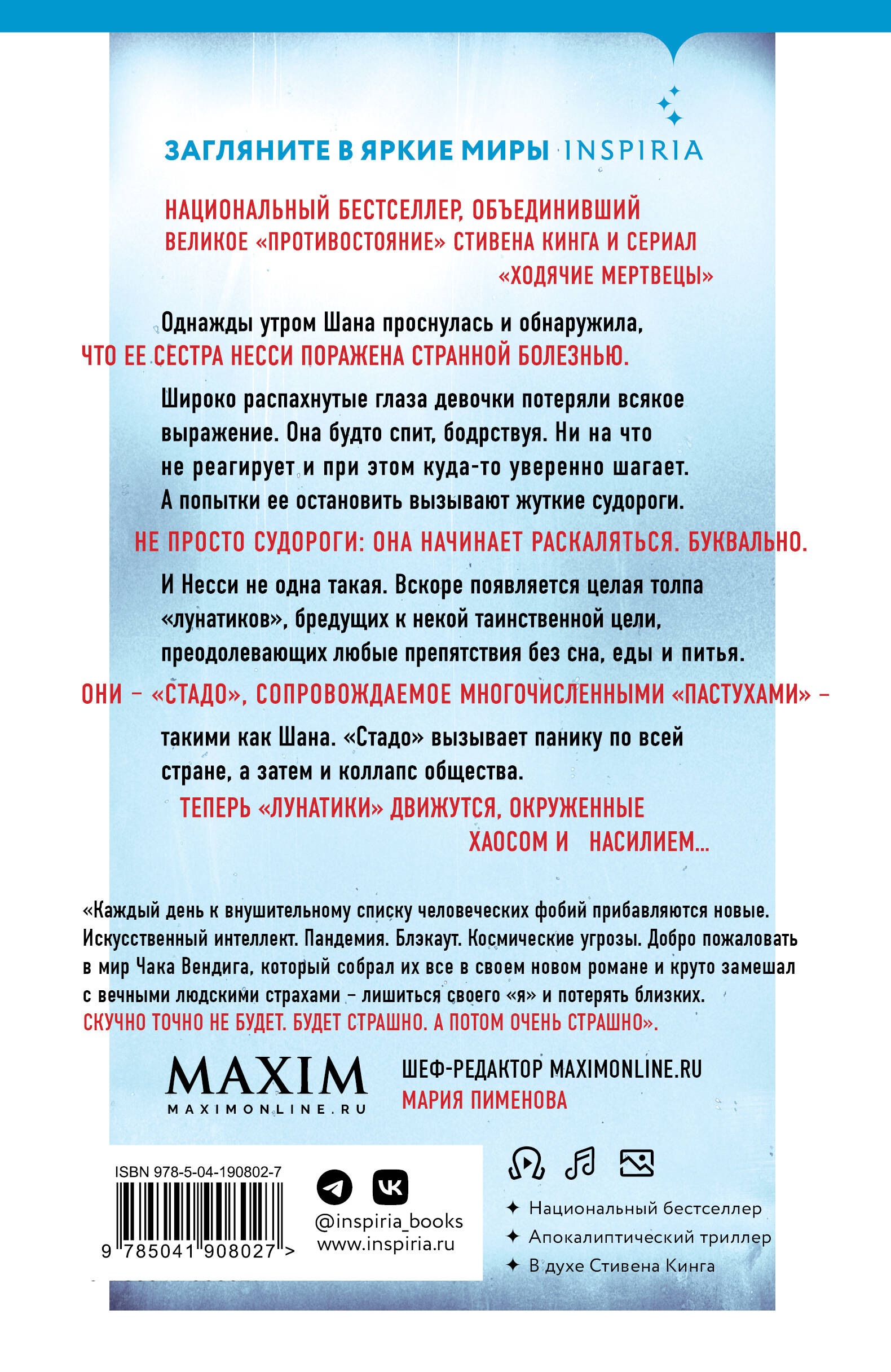 НАЦИОНАЛЬНЫЙ БЕСТСЕЛЛЕР, ОБЪЕДИНИВШИЙ «ПРОТИВОСТОЯНИЕ» СТИВЕНА КИНГА И СЕРИАЛ «ХОДЯЧИЕ МЕРТВЕЦЫ». ЛУЧШАЯ КНИГА ГОДА ПО ВЕРСИИ THE WASHINGTON POST, THE GUARDIAN, KIRKUS REVIEWS, PUBLISHERS WEEKLY, LIBRARY JOURNAL. НОМИНАНТ НА ПРЕМИЮ GOODREADS CHOICE. НАД ЭКРАНИЗАЦИЕЙ РАБОТАЕТ ГЛЕН МАЗЗАРА, СЦЕНАРИСТ И ПРОДЮСЕР «ХОДЯЧИХ МЕРТВЕЦОВ». Однажды утром Шана проснулась и обнаружила, что ее сестра Несси поражена странной болезнью. Широко распахнутые глаза девочки потеряли всякое выражение. Она будто спит, бодрствуя. Ни на что не реагирует, и при этом куда-то уверенно шагает. А попытки ее остановить вызывают жуткие судороги. Не просто судороги: она начинает… раскаляться. Буквально. И Несси не одна такая. Вскоре появляется целая толпа «лунатиков», бредущих к некой таинственной цели, преодолевающих любые препятствия без сна, еды и питья. Они - «стадо», сопровождаемое многочисленными «пастухами» - такими как Шана. «Стадо» вызывает панику по всей стране, а затем и коллапс общества. Теперь «лунатики» движутся, окруженные хаосом и насилием… ------------------------------------------------------------------------------------------------------------ «Выдающаяся вещь… Роман напомнил мне "Противостояние" Кинга, но осмелюсь сказать: эта история даже лучше». - Джеймс Роллинс «Тревожно, неожиданно, доставляет удовольствие и заставляет крепко задуматься». - Харлан Кобен «Шедевр прозы, столь же пронзительный и душераздирающий, как "Станция Одиннадцать"». - Пенг Шеперд «Изобретательная, неистовая, бескомпромиссная работа мастера, который умеет заставить забыть про сон». - Пол Тремблей «Поверьте мне: к такому никто не готов». - Делайла С. Доусон «Цунами, а не роман». - Мег Гардинер «Просто голливудский блокбастер». - Питер Клайнз «Эту книгу стоит рассматривать как аналог хитовых сериалов вроде "Остаться в живых"». - Book Riot| Издательство | ООО "Издательство "Эксмо" |