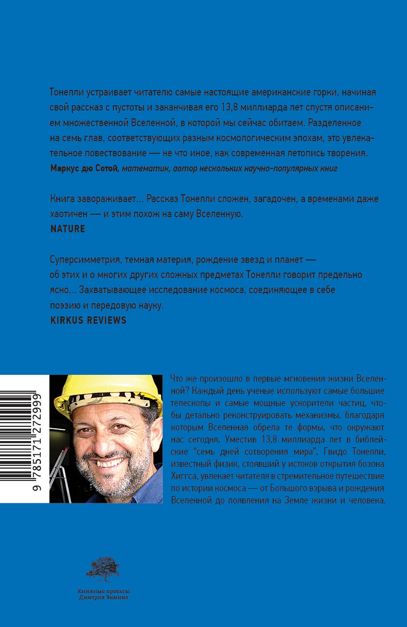 "Книга Бытия" всемирно известного физика Гвидо Тонелли хоть и поделена на семь частей в соответствии с семью днями сотворения мира, но охватывает намного более значительный временной отрезок, а именно 13,8 миллиарда лет. Тонелли задается целью описать жизнь Вселенной от ее первых мгновений до наших дней. Большой взрыв, космическая инфляция, бозон Хиггса, материя, антиматерия, первые протоны, а затем фотоны, кварки и лептоны, первые ядра и атомы, ядерные процессы, первая звезда, галактики и сила гравитации… Все это сочетается у автора с историей науки, литературой, кино, рекламой и даже мифологическими сюжетами. Так, говоря о концепции пустоты, он противопоставляет греческую школу мысли, которая отрицала возможность небытия, и Индуистскую мифологию, где Шива раз за разом разрушает вселенную до абсолютного нуля, а затем снова воздвигает ее из ничего. Тонелли объясняет сложнейшие процессы в нескольких предложениях, тут же подкрепляя сказанное тем или другим культурным явлением. Он отталкивается от человеческого взгляда на мироздание, поэтому и язык его повествования понятен и прост. В конечном счете "Книга бытия" рассказывает о Вселенной так, чтобы человек осознал себя ее продолжением.| Издательство | ИЗДАТЕЛЬСТВО "АСТ" |