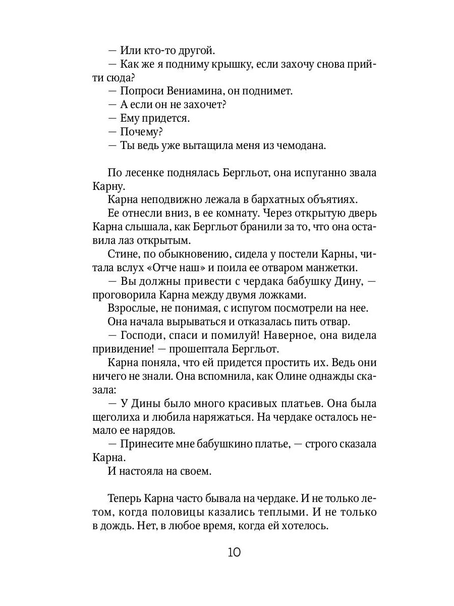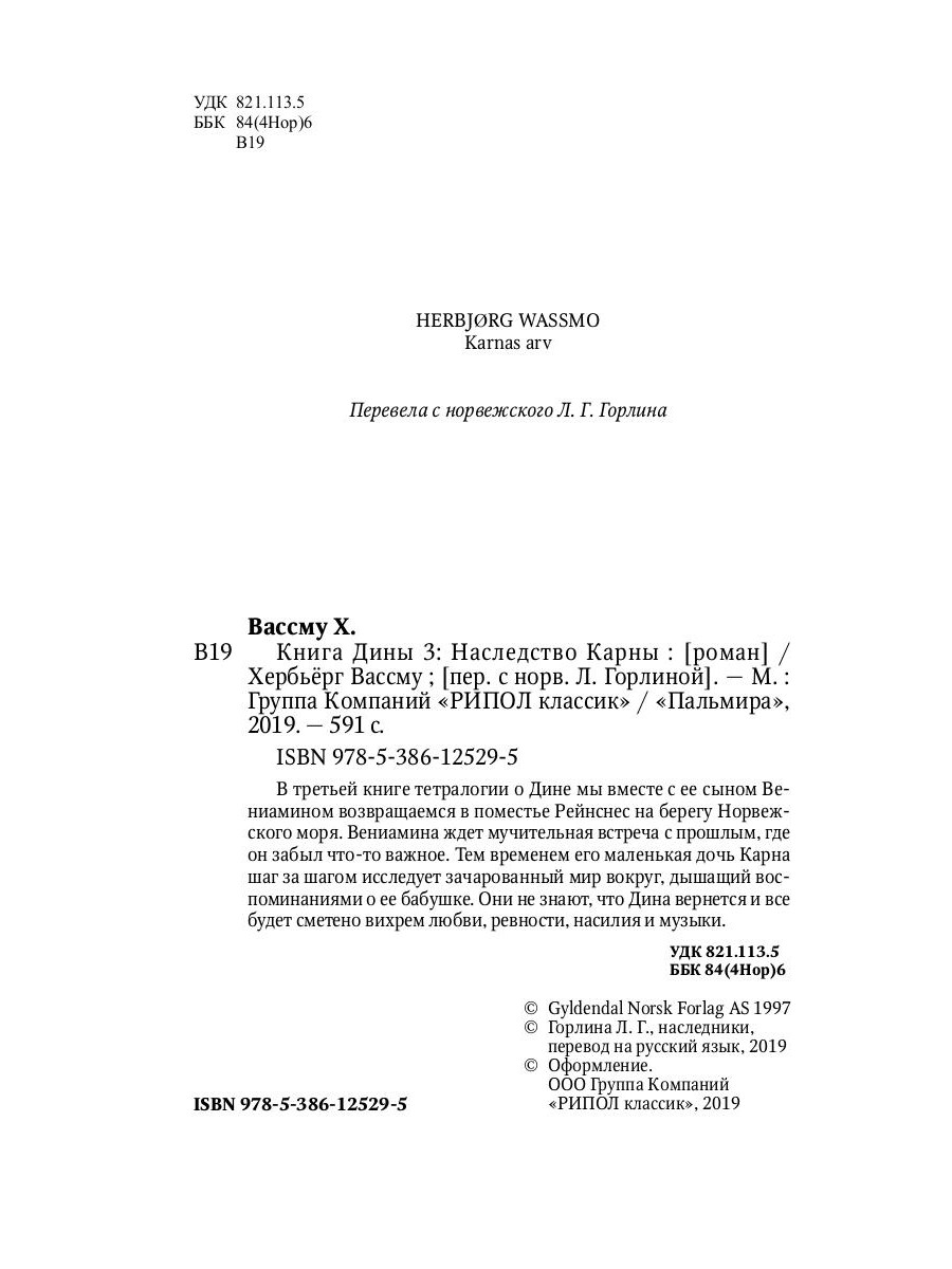 В третьей книге тетралогии о Дине мы вместе с ее сыном Вениамином возвращаемся в поместье Рейнснес на берегу Норвежского моря. Вениамина ждет мучительная встреча с прошлым, где он забыл что-то важное. Тем временем его маленькая дочь Карна шаг за шагом исследует зачарованный мир вокруг, дышащий воспоминаниями о ее бабушке. Они не знают, что Дина вернется и все будет сметено вихрем любви, ревности, насилия и музыки.| Издательство | Рипол Классик |