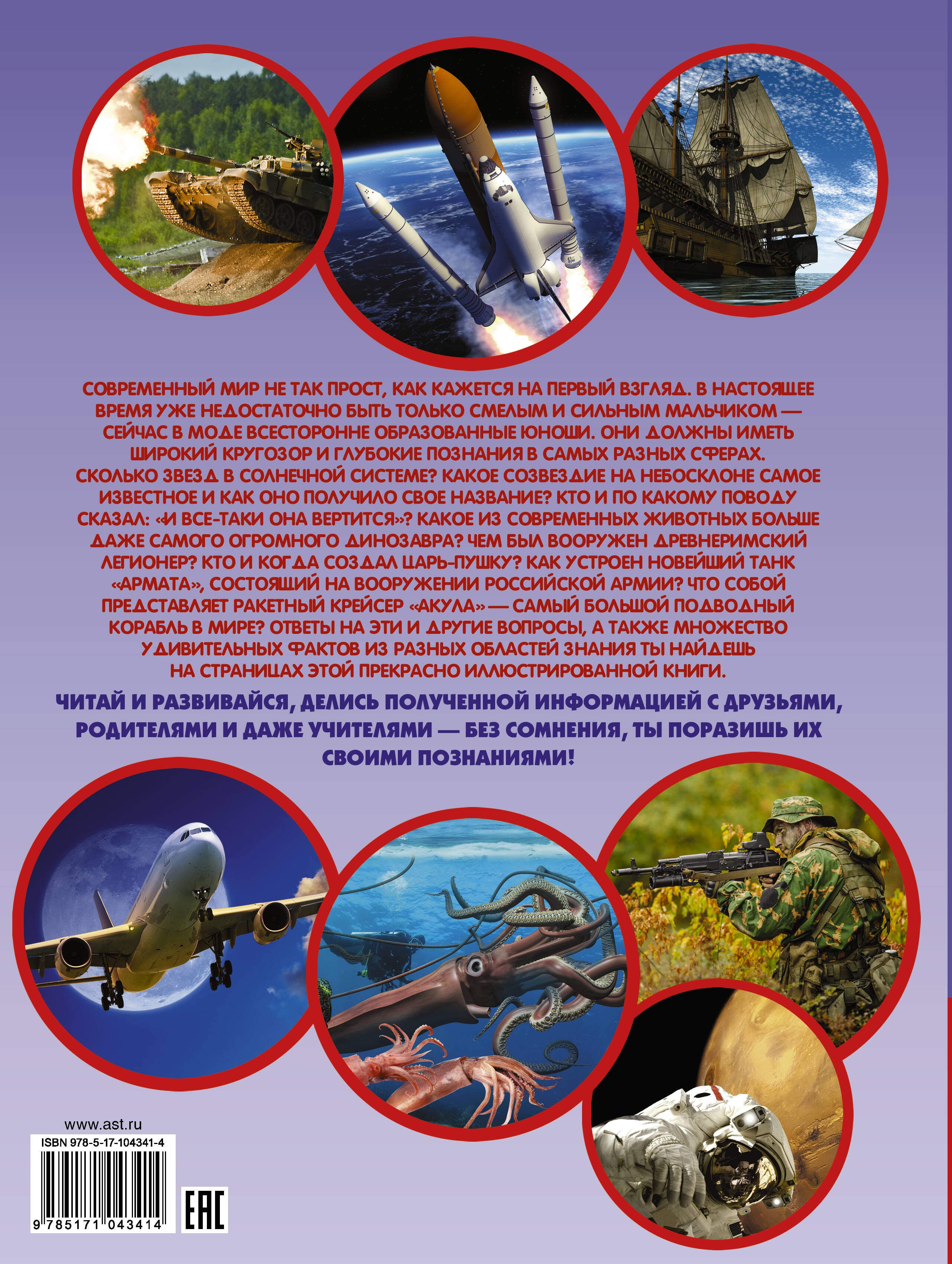 Современный мир не так прост, как кажется на первый взгляд. В настоящее время уже недостаточно быть только смелым и сильным мальчиком - сейчас в моде всесторонне образованные юноши. Они должны иметь широкий кругозор и глубокие познания в самых разных сферах. Сколько звезд в Солнечной системе? Какое созвездие на небосклоне самое известное и как оно получило свое название? Кто и по какому поводу сказал: «И все-таки она вертится»? Какое из современных животных больше даже самого огромного динозавра? Чем был вооружен древнеримский легионер? Кто и когда создал Царь-пушку? Как устроен новейший танк «Армата», состоящий на вооружении российской армии? Что собой представляет ракетный крейсер «Акула» - самый большой подводный корабль в мире? Ответы на эти и другие вопросы, а также множество удивительных фактов из разных областей знания ты найдешь на страницах этой прекрасно иллюстрированной книги. Читай и развивайся, делись полученной информацией с друзьями, родителями и даже учителями - без сомнения, ты поразишь их своими познаниями!| Издательство | Издательство "АСТ" |