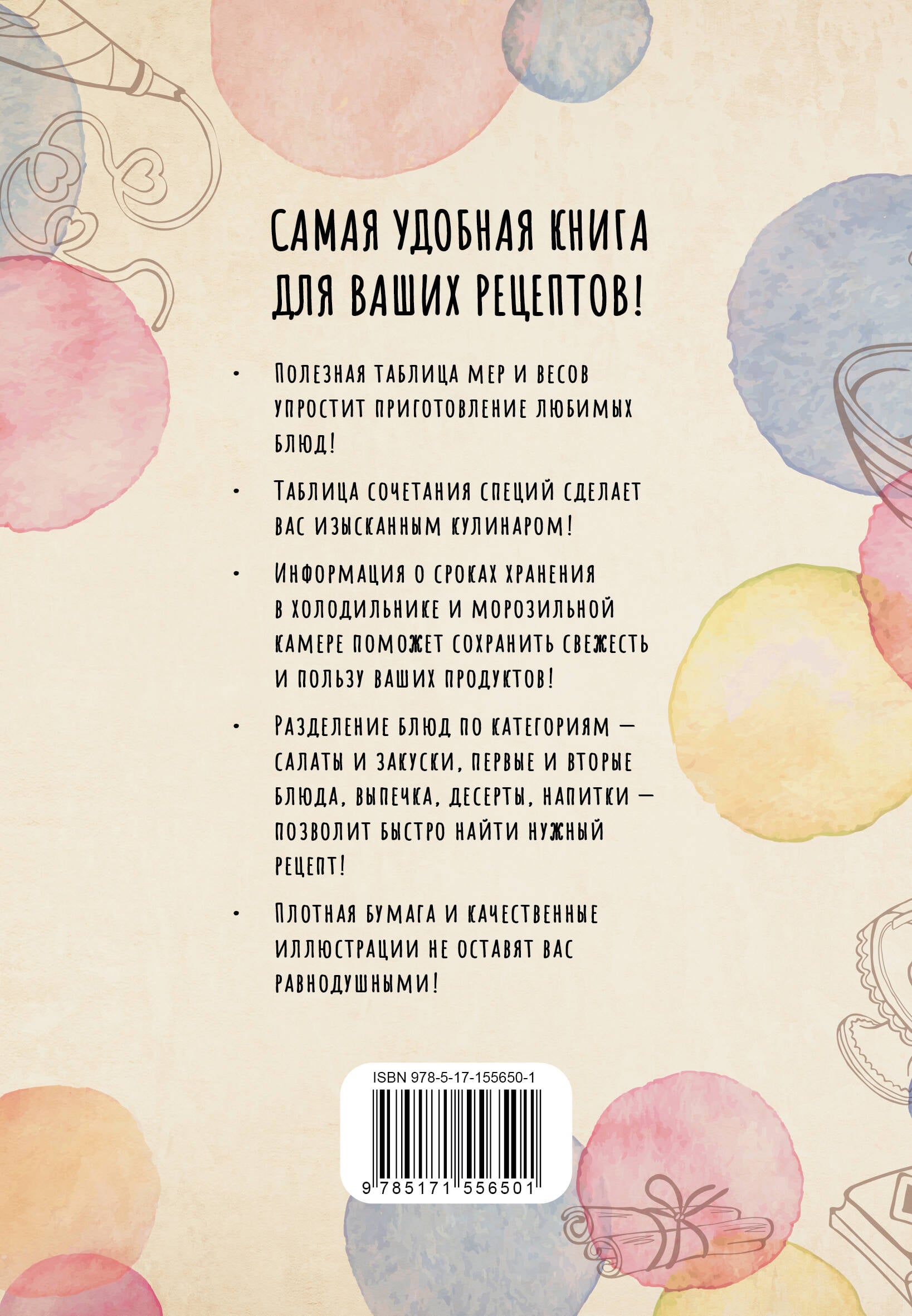 САМАЯ УДОБНАЯ КНИГА ДЛЯ ВАШИХ РЕЦЕПТОВ! • Полезная таблица мер и весов упростит приготовление любимых блюд! • Таблица сочетания специй сделает вас изысканным кулинаром! • Информация о сроках хранения в холодильнике и морозильной камере поможет сохранить свежесть и пользу ваших продуктов! • Разделение блюд по категориям - салаты и закуски, первые и вторые блюда, выпечка, десерты, напитки - позволит быстро найти нужный рецепт! • Плотная бумага и качественные иллюстрации не оставят вас равнодушными!| Издательство | ИЗДАТЕЛЬСТВО "АСТ" |