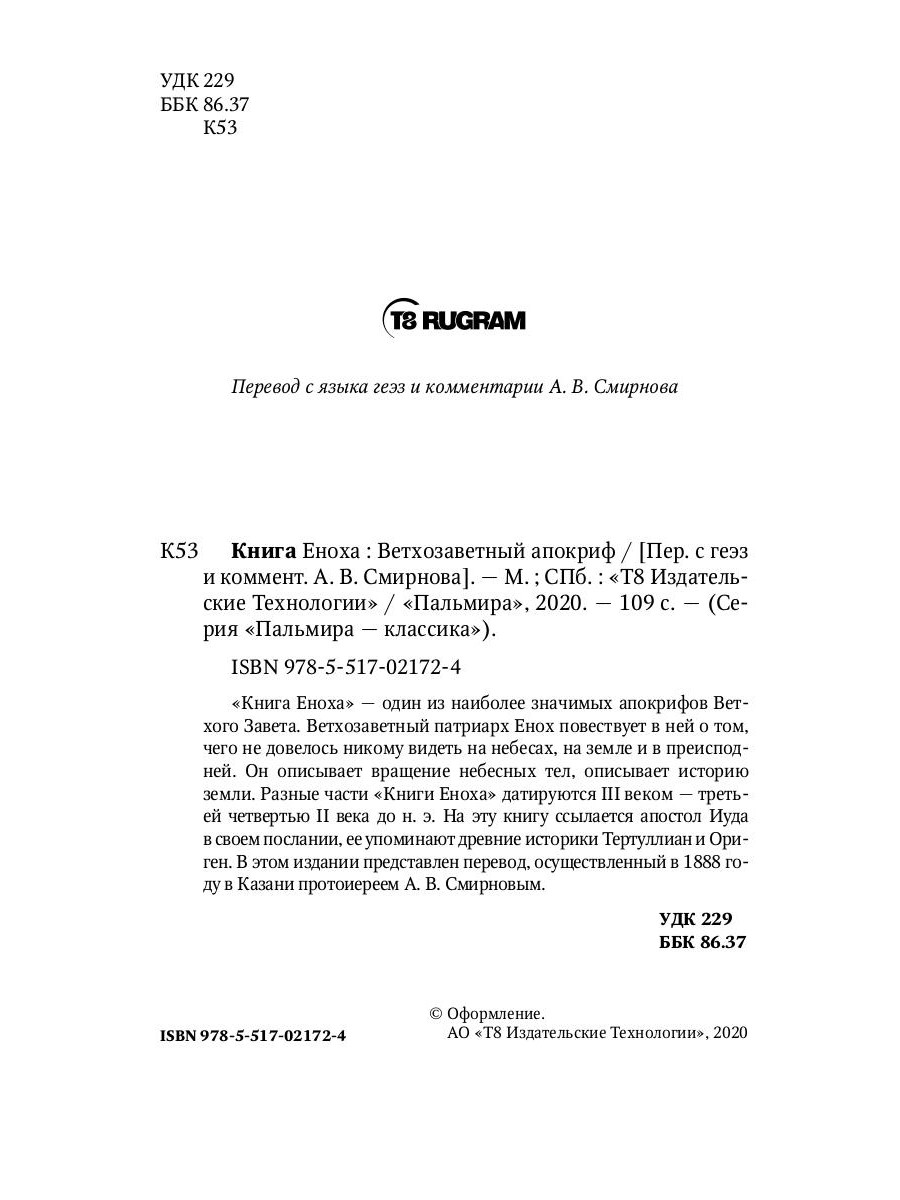 «Книга Еноха» - один из наиболее значимых апокрифов Ветхого Завета. Ветхозаветный патриарх Енох повествует в ней о том, чего не довелось никому видеть на небесах, на земле и в преисподней. Он описывает вращение небесных тел, описывает историю земли. Разные части «Книги Еноха» датируются III веком - третьей четвертью II века до н.э. На эту книгу ссылается апостол Иуда в своем послании, ее упоминают древние историки Тертуллиан и Ориген. В этом издании представлен перевод, осуществленный в 1888 году в Казани протоиереем А.В. Смирновым.