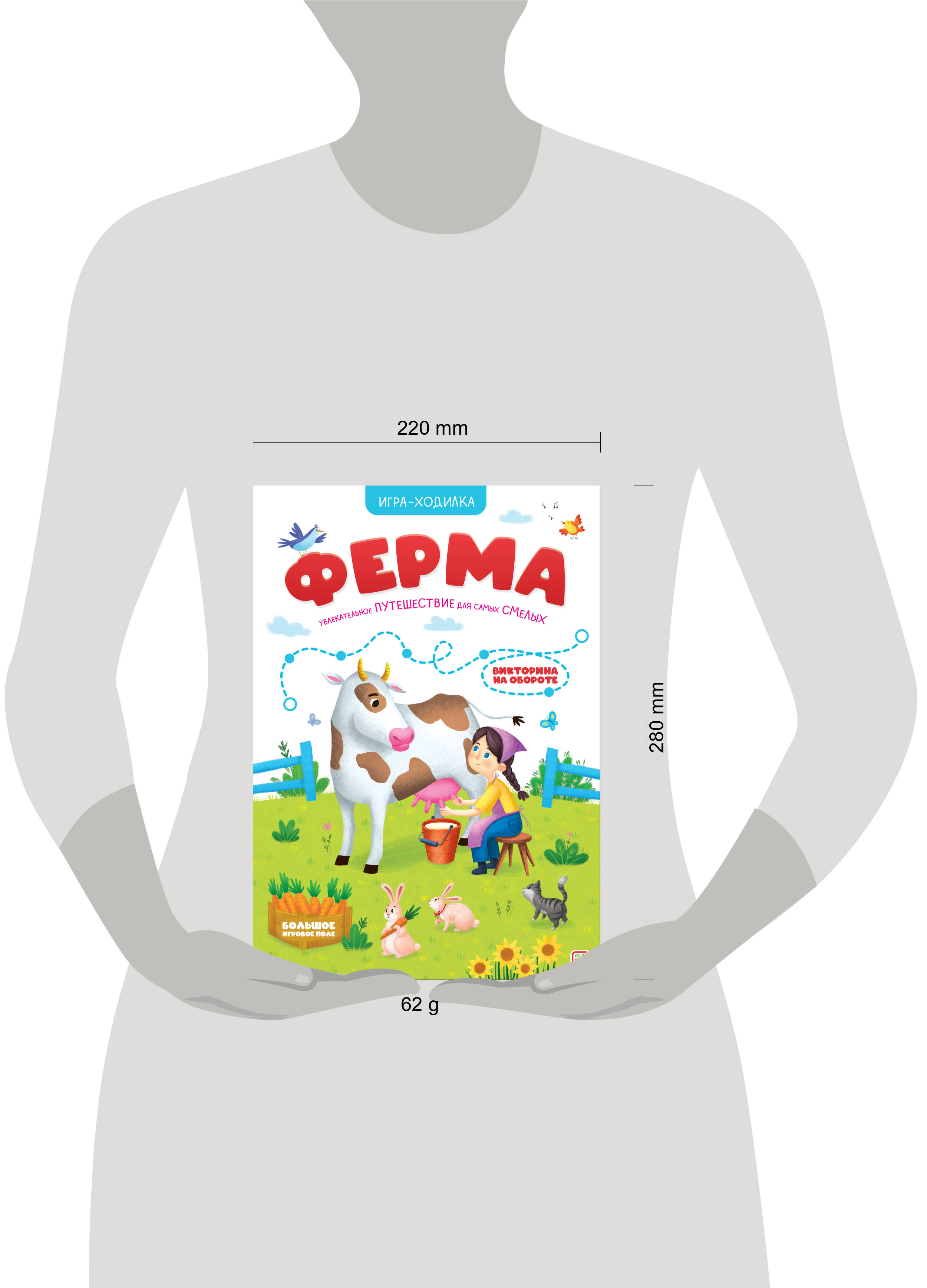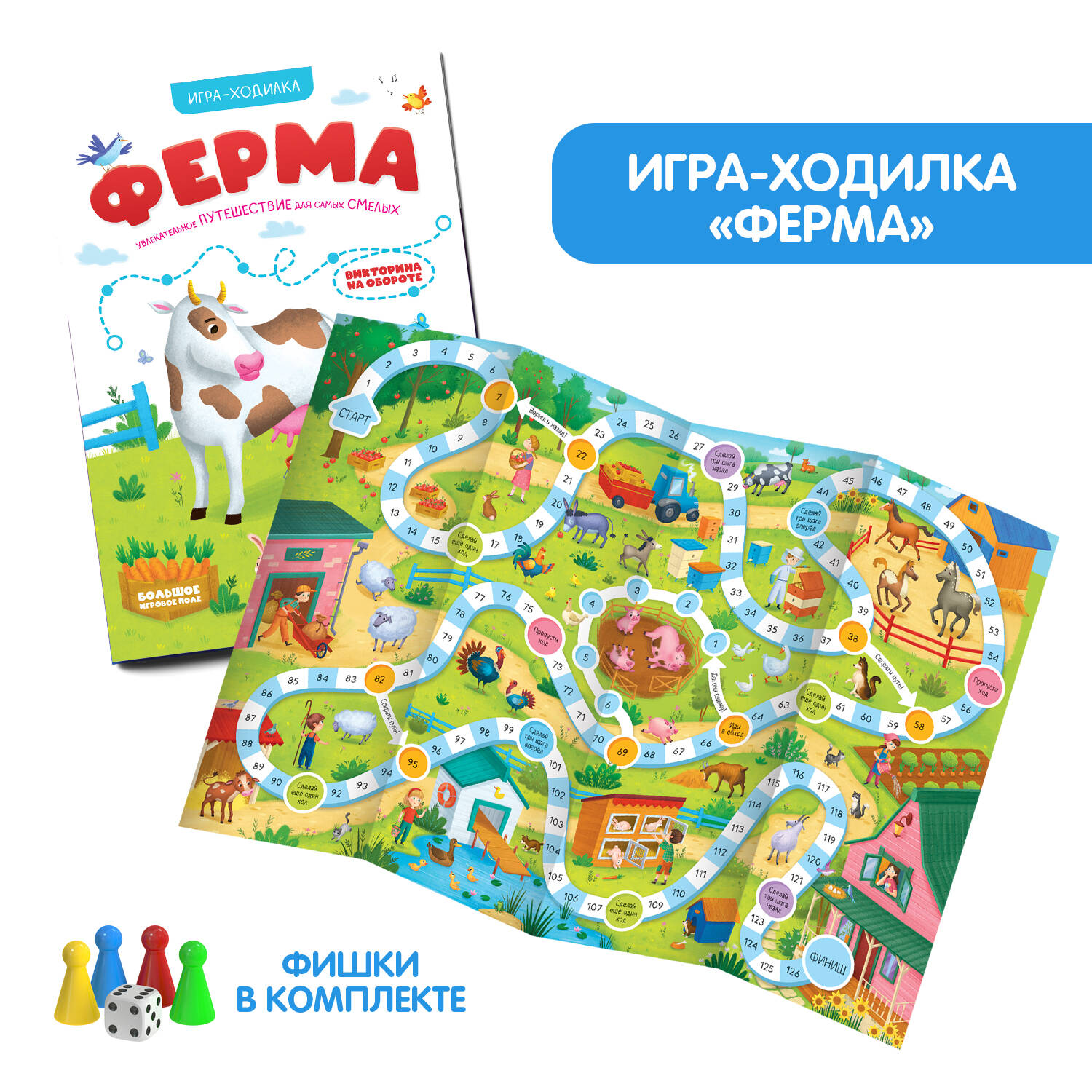 Игры-ходилки от торговой марки Malamalama - это весёлое и познавательное развлечение для малыша. Каждая книжка разворачивается в большой плакат, на одной стороне которого вы найдёте увлекательную настольную игру, а на другой - викторину с удивительными фактами. Вместе с игрой-ходилкой "Ферма" ребёнок отправится на весёлую прогулку по большому и шумному домашнему хозяйству. Продвигаясь вперёд по красочному игровому полю, малыш встретится с милыми животными, понаблюдает, как собирают урожай и ухаживают за садом и огородом. А на обороте будут ждать 36 интересных вопросов обо всём, что можно встретить на ферме. С этими вопросами ребёнок сможет проверить свои знания и расширить кругозор. Фишки и кубик включены в комплект - игра полностью готова к тому, чтобы подарить малышу множество весёлых моментов.