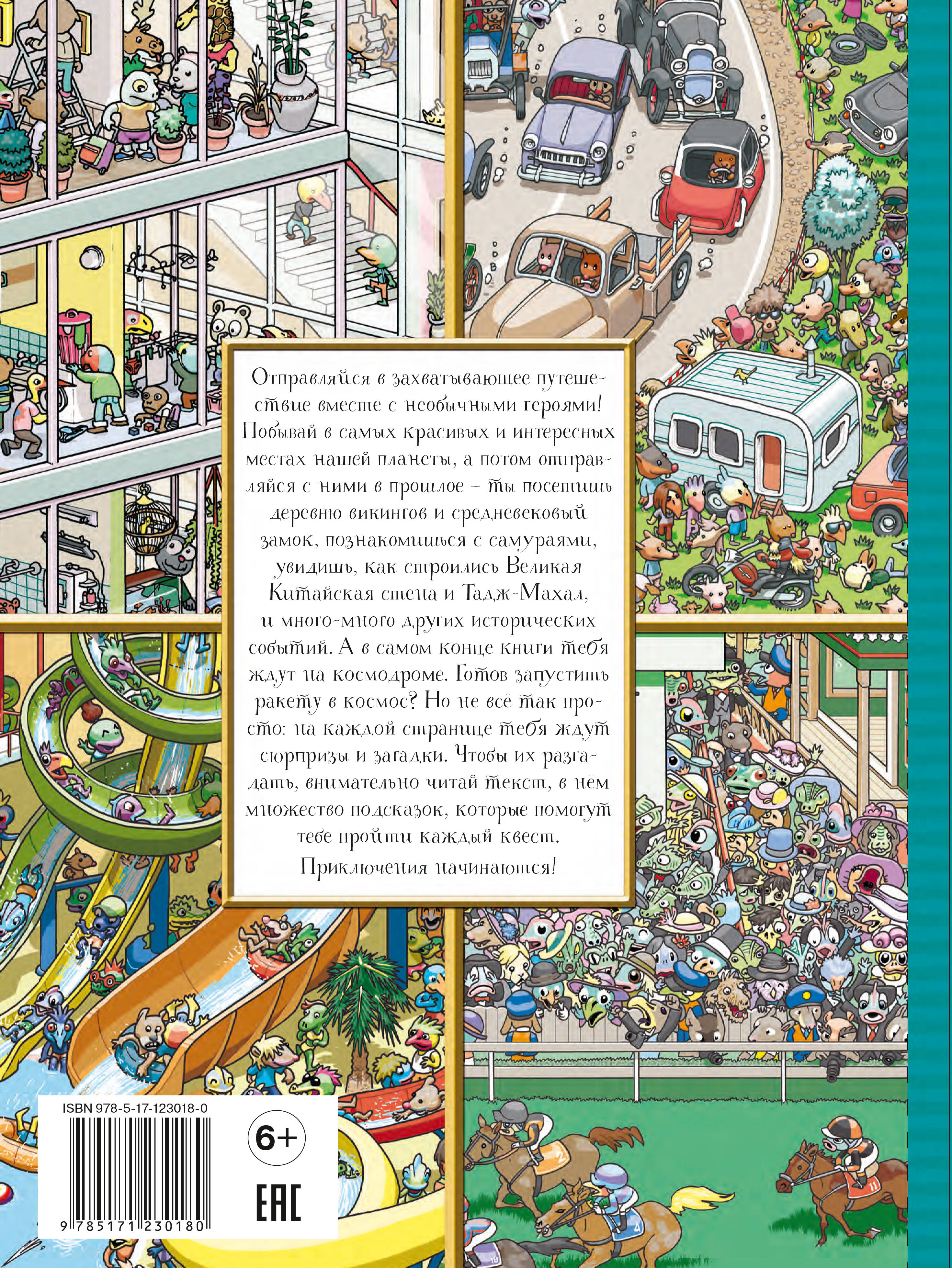 Отправляйся в захватывающее путешествие вместе с необычными героями! Побывай в самых красивых и интересных местах нашей планеты, а потом отправляйся с ними в прошлое - ты посетишь деревню викингов и средневековый замок, познакомишься с самураями, увидишь, как строились Великая Китайская стена и Тадж-Махал, и много-много других исторических событий. А в самом конце книги тебя ждут на космодроме, готов запустить ракету в космос? Но не всё так просто: на каждой странице тебя ждут сюрпризы и загадки. Чтобы их разгадать, внимательно читай текст, в нем множество подсказок, которые помогут тебе пройти каждый квест. Приключения начинаются!| Издательство | ИЗДАТЕЛЬСТВО "АСТ" |