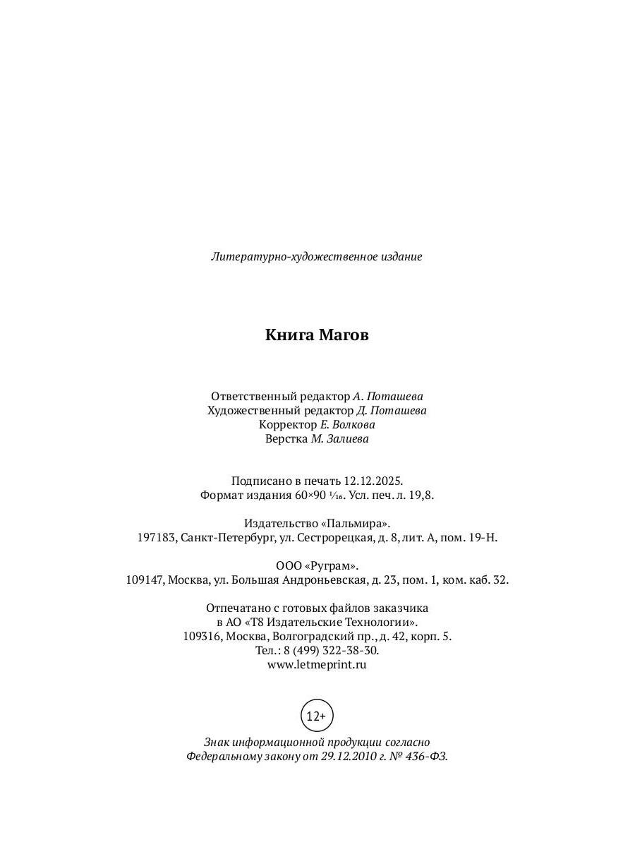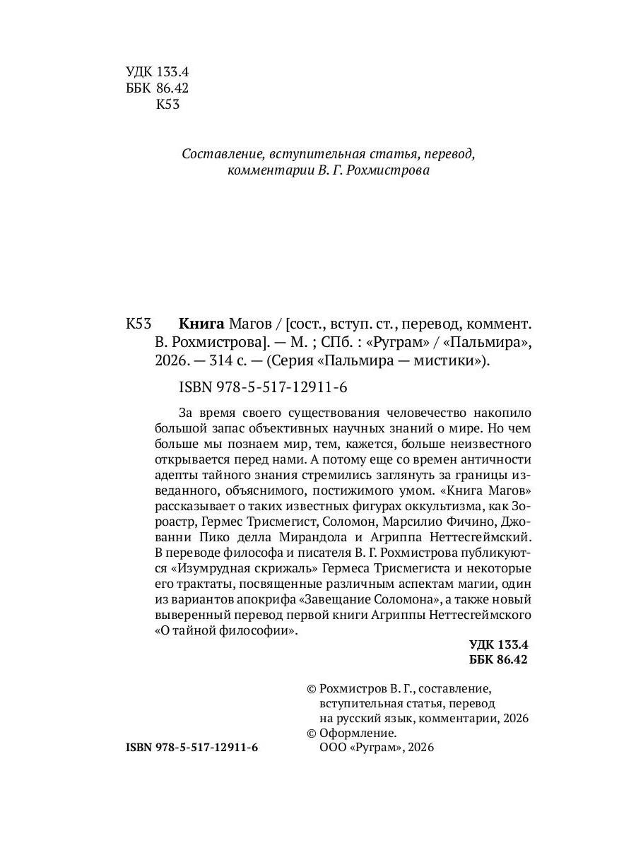 За время своего существования человечество накопило большой запас объективных научных знаний о мире. Но чем больше мы познаем мир, тем, кажется, больше неизвестного открывается перед нами. А потому еще со времен античности адепты тайного знания стремились заглянуть за границы изведанного, объяснимого, постижимого умом. «Книга Магов» рассказывает о таких известных фигурах оккультизма, как Зороастр, Гермес Трисмегист, Соломон, Марсилио Фичино, Джованни Пико делла Мирандола и Агриппа Неттесгеймский. В переводе философа и писателя В. Г. Рохмистрова публикуются «Изумрудная скрижаль» Гермеса Трисмегиста и некоторые его трактаты, посвященные различным аспектам магии, один из вариантов апокрифа «Завещание Соломона», а также новый выверенный перевод первой книги Агриппы Неттесгеймского «О тайной философии».| Издательство | Т8 RUGRAM |