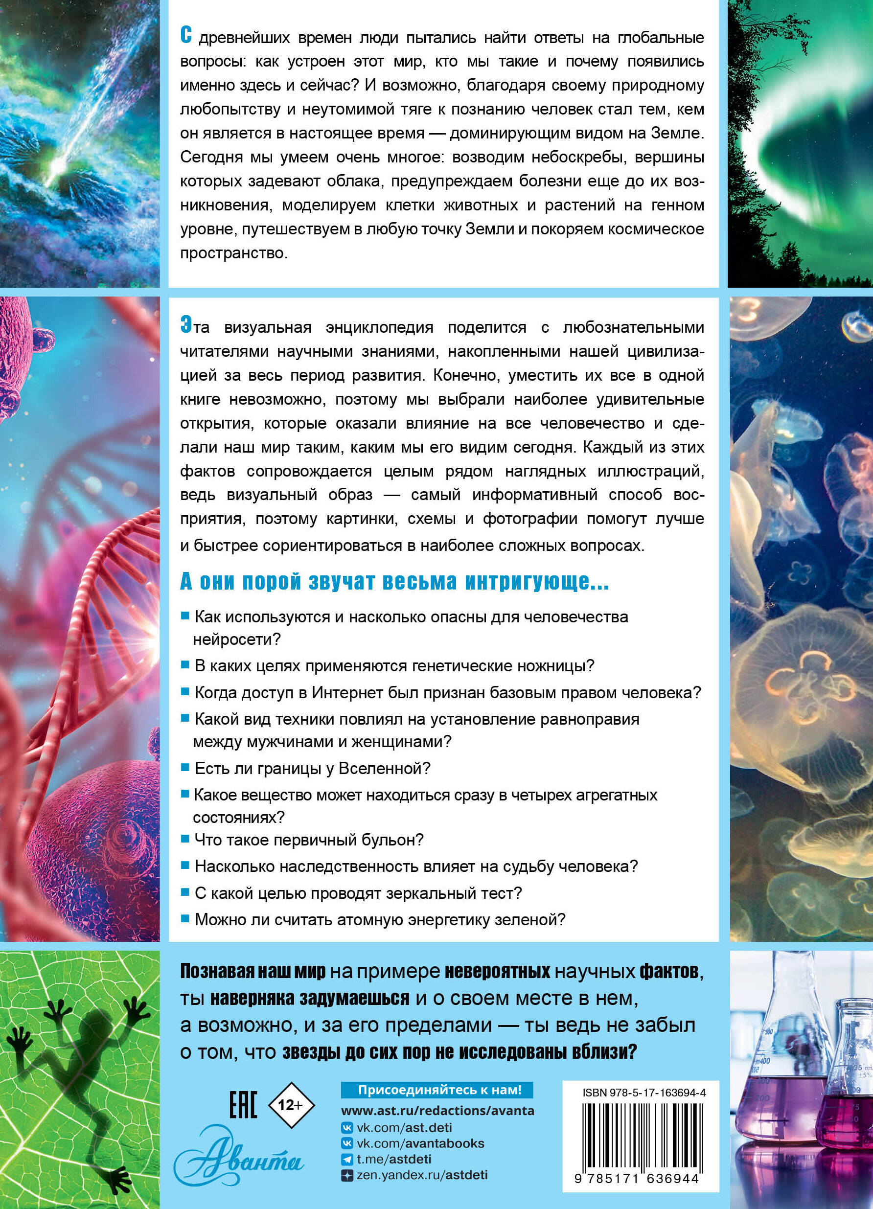 В книге описываются ключевые научные открытия человеческой цивилизации, оказавшие огромное влияние на формирование современного мира. Например, сегодня невозможно представить нашу жизнь без электричества и бесчисленного множества высокотехнологичных приборов, быстрого транспорта и мгновенного обмена информацией с любой точкой мира. Мы знаем, как устроена наша Вселенная, из чего состоит и какие свойства имеет любая окружающая нас материя. Но все эти знания человек получил не сразу, на пути к познанию он совершал ошибки, часто заблуждался, однако в итоге всегда находил верное решение благодаря своей любознательности и стремлению к познанию. Самые интересные научные факты обо всем на свете - о природе Земли и космическом пространстве, горных вершинах и океанских глубинах, строении клеток и о многом другом - увлекательно изложены в этой визуальной энциклопедии. Все они сопровождаются наглядными иллюстрациями и подробными схемами, которые помогут юным читателям разобраться в наиболее сложных вопросах. Благодаря этому изданию они смогут узнать самые удивительные факты из современного мира науки, о которых многие их сверстники даже не подозревают. Для старшего школьного возраста.| Издательство | Издательство "АСТ" |