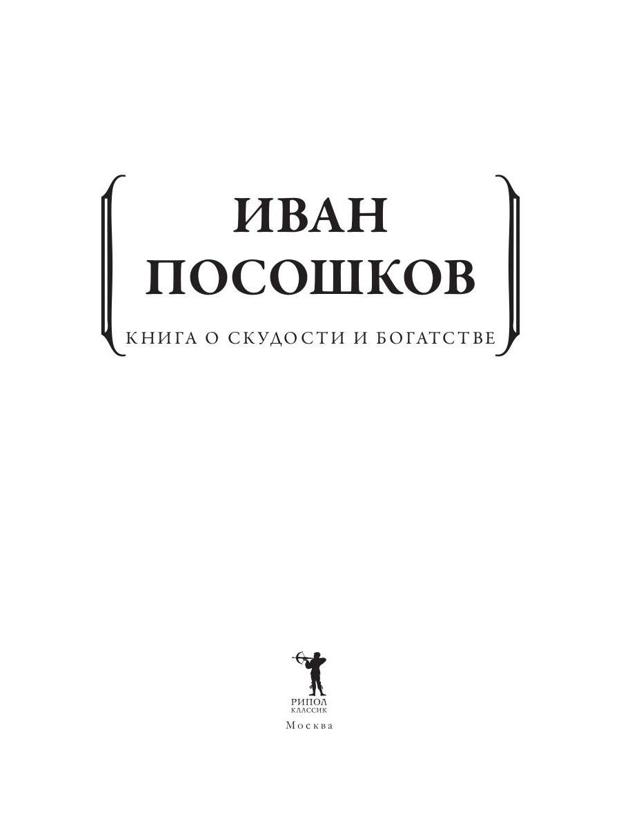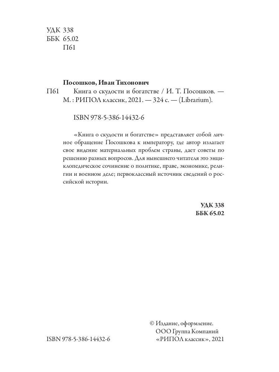 Об Иване Тихоновиче Посошкове известно очень мало: мыслитель, экономист-самоучка, сын зажиточного крестьянина в эпоху правления Петра I, репрессирован и умер в Петропавловской тюрьме в 1726 году. Такая загадочность увлекает не меньше его главного произведения - «Книги о скудости и богатстве». «Книга о скудости и богатстве» представляет собой личное обращение Посошкова к императору, где автор излагает свое видение материальных проблем страны, дает советы по решению разных вопросов. Для нынешнего читателя это энциклопедическое сочинение о политике, праве, экономике, религии и военном деле; первоклассный источник сведений о российской истории.| Издательство | Рипол Классик |
