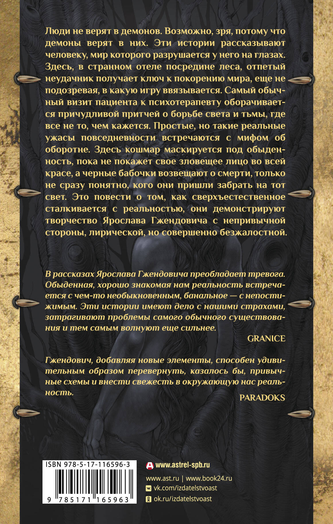 Люди не верят в демонов. Возможно, зря, потому что демоны верят в них. Эти истории рассказывают человеку, мир которого разрушается у него на глазах. Здесь, в странном отеле посредине леса, отпетый неудачник получает ключ к покорению мира, еще не подозревая, в какую игру ввязывается. Самый обычный визит пациента к психотерапевту оборачивается причудливой притчей о борьбе света и тьмы, где все не то, чем кажется. Простые, но такие реальные ужасы повседневности встречаются с мифом об оборотне. Здесь кошмар маскируется под обыденность, пока не покажет свое зловещее лицо во всей красе, а черные бабочки возвещают о смерти, только не сразу понятно, кого они пришли забрать на тот свет. Это повести о том, как сверхъестественное сталкивается с реальностью, они демонстрируют творчество Ярослава Гжендовича с непривычной стороны, лирической, но совершенно безжалостной.| Издательство | ИЗДАТЕЛЬСТВО "АСТ" |