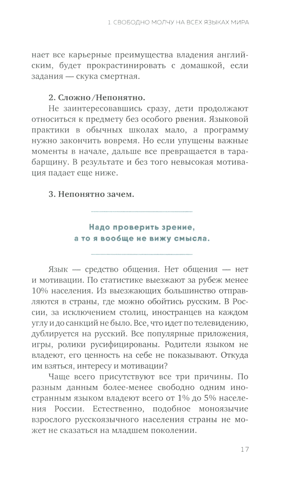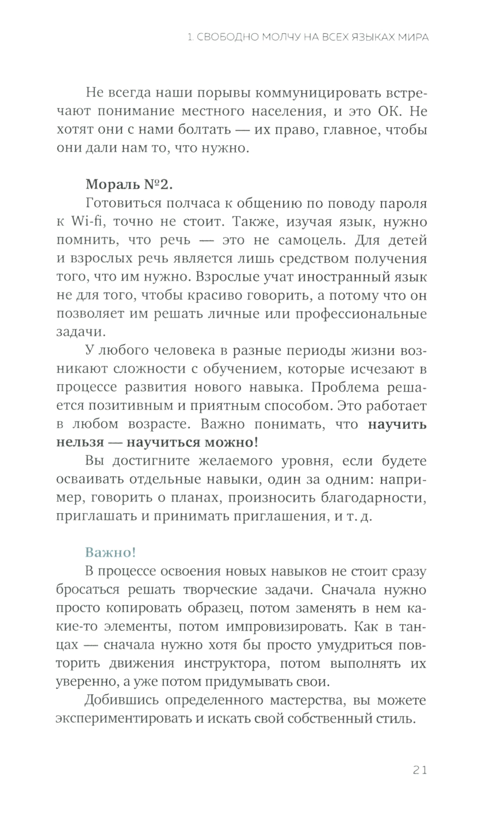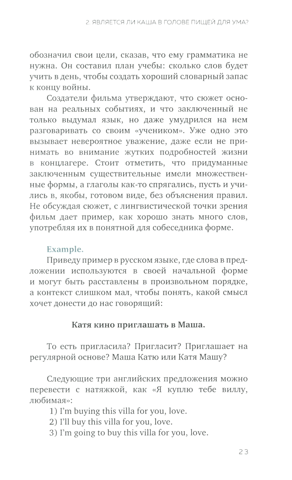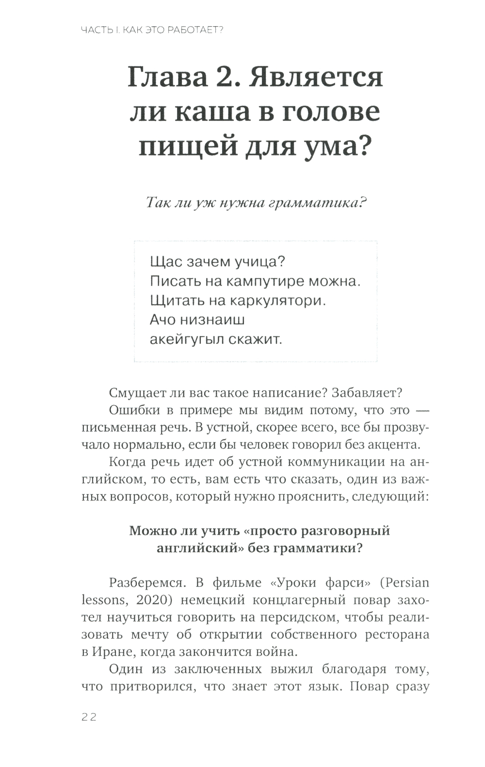 Свободно молчите на всех языках мира, хотя все понимаете (почти)? Считаете, что английский в вашем возрасте нереально улучшить? Устали подтягивать грамматику, забываете слова? Автор книги уверена: изучение языка - это процесс, и им можно наслаждаться! Как тренировка в спортзале прокачивает ваши бицепсы, так и ваши лингвистические мускулы можно развить и получать от этого удовольствие, а не стресс и разочарование. Эта книга прояснит традиционно сложные для русскоязычных студентов времена глаголов, раз и навсегда, без тысячи занудных упражнений с помощью сторителлинга, когнитивных искажений, триггеров и якорей для памяти! Мемы, трогательные и забавные истории, смешные цитаты, загадки в тандеме с понятным объяснением структур позволят, наконец, понять, как это работает. Читайте и открывайте для себя богатство английского языка с удовольствием! И начните уже, наконец, на нем разговаривать! Всем НЕ павшим и Не потерявшим задора в борьбе с освоением английской грамматики посвящается.