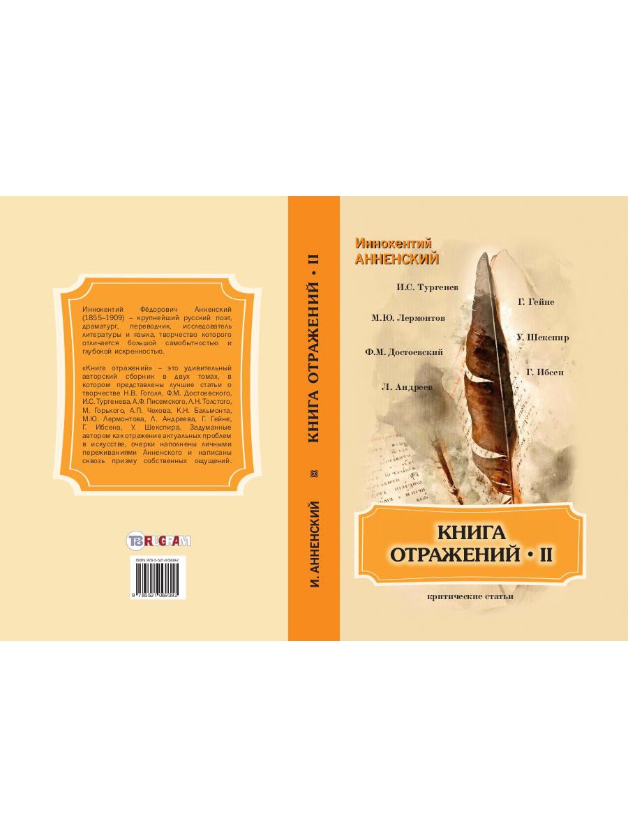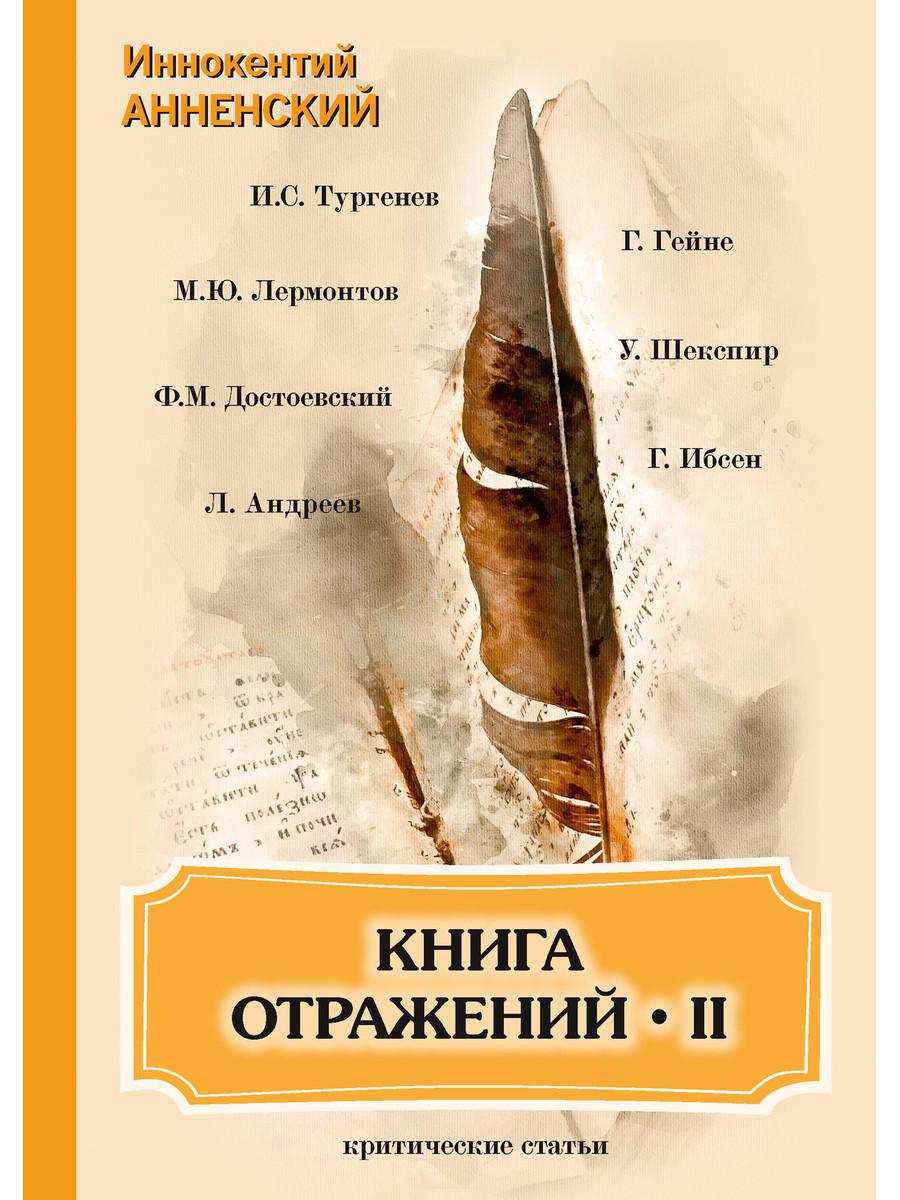 «Книга отражений» - это удивительный авторский сборник в двух томах, в котором представлены лучшие статьи о творчестве Н.В. Гоголя, Ф.М. Достоевского, И.С. Тургенева, А.Ф. Писемского, Л.Н. Толстого, М. Горького, А.П. Чехова, К.Н. Бальмонта, М.Ю. Лермонтова, Л. Андреева, Г. Гейне, Г. Ибсена, У. Шекспира. Задуманные автором как отражение актуальных проблем в искусстве, очерки наполнены личными переживаниями Анненского и написаны сквозь призму собственных ощущений.