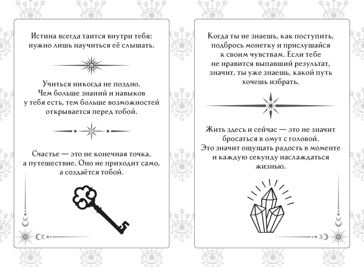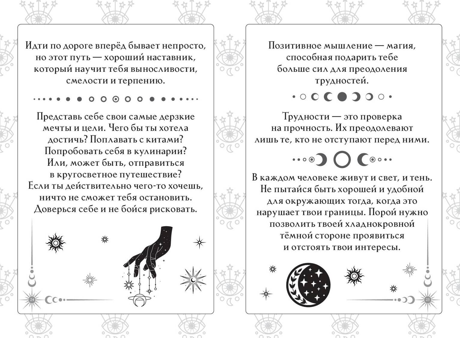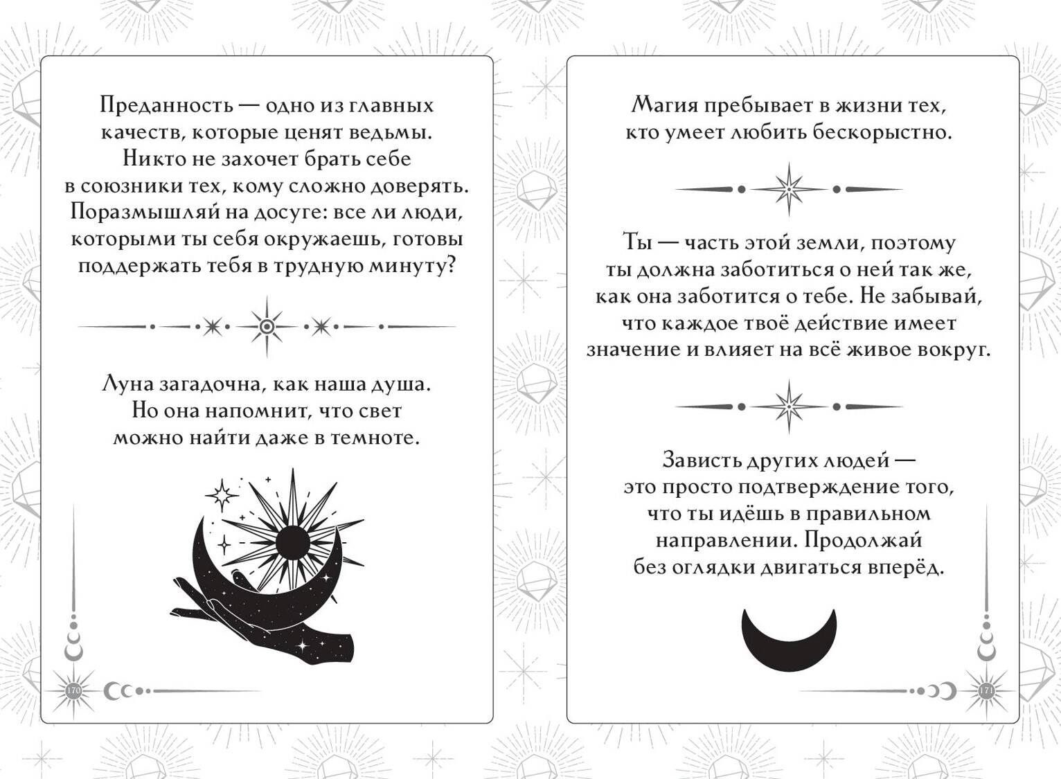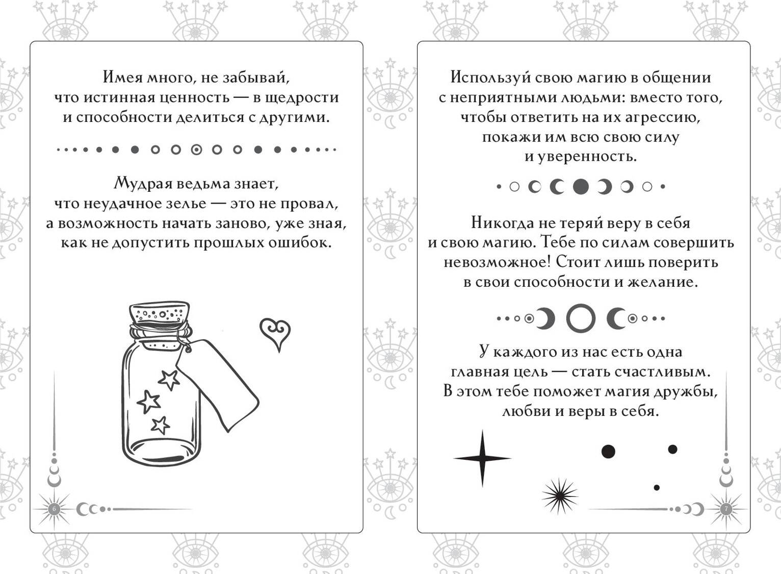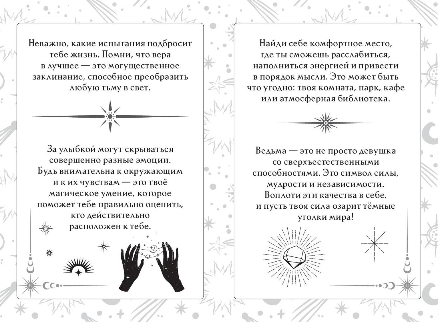 Получи знаки судьбы с помощью магической книги гаданий! Когда рядом нет волшебного шара или карт, заглянуть в будущее тебе позволит мудрость древних ведьм, заключенная в этой чародейской книге предсказаний. Здесь ты найдешь ценные подсказки и советы, которые развеют твои сомнения и помогут разобраться в своих чувствах. Тебе нужно лишь наугад открыть страницу, и книга покажет тебе свое послание! Можно гадать наедине с собой или в кругу друзей - так вы сможете не только весело провести время, но и укрепить ваши магические узы. А еще книга гаданий станет волшебным подарком на день рождения и любой другой праздник.| Издательство | ООО "Издательство "Эксмо" |
