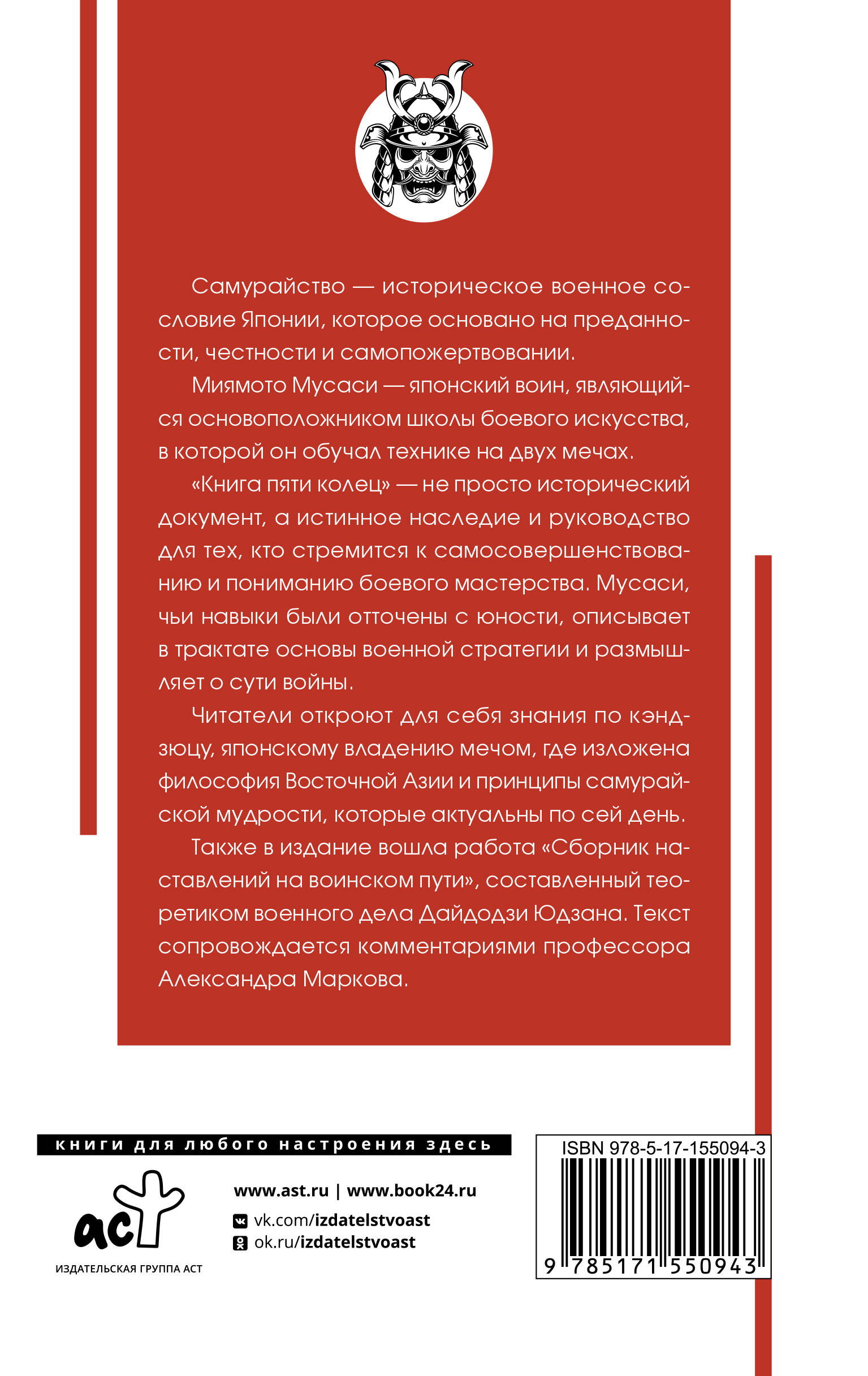 Самурайство - историческое военное сословие Японии, которое основано на преданности, честности и самопожертвовании. Миямото Мусаси - японский воин, являющийся основоположником школы боевого искусства, в которой он обучал технике на двух мечах. "Книга пяти колец" - не просто исторический документ, а истинное наследие и руководство для тех, кто стремится к самосовершенствованию и пониманию боевого мастерства. Мусаси, чьи навыки были отточены с юности, описывает в трактате основы военной стратегии и размышления о сути войны. Читатели откроют для себя знания по кэндзюцу, японскому владению мечом, где изложена философия Восточной Азии и принципы самурайской мудрости, которые актуальны по сей день. Также в издание вошла работа "Сборник наставлений на воинском пути", составленный теоретиком военного дела Дайдодзи Юдзана. Текст сопровождается комментариями историка Александра Маркова.| Издательство | Издательство "АСТ" |
