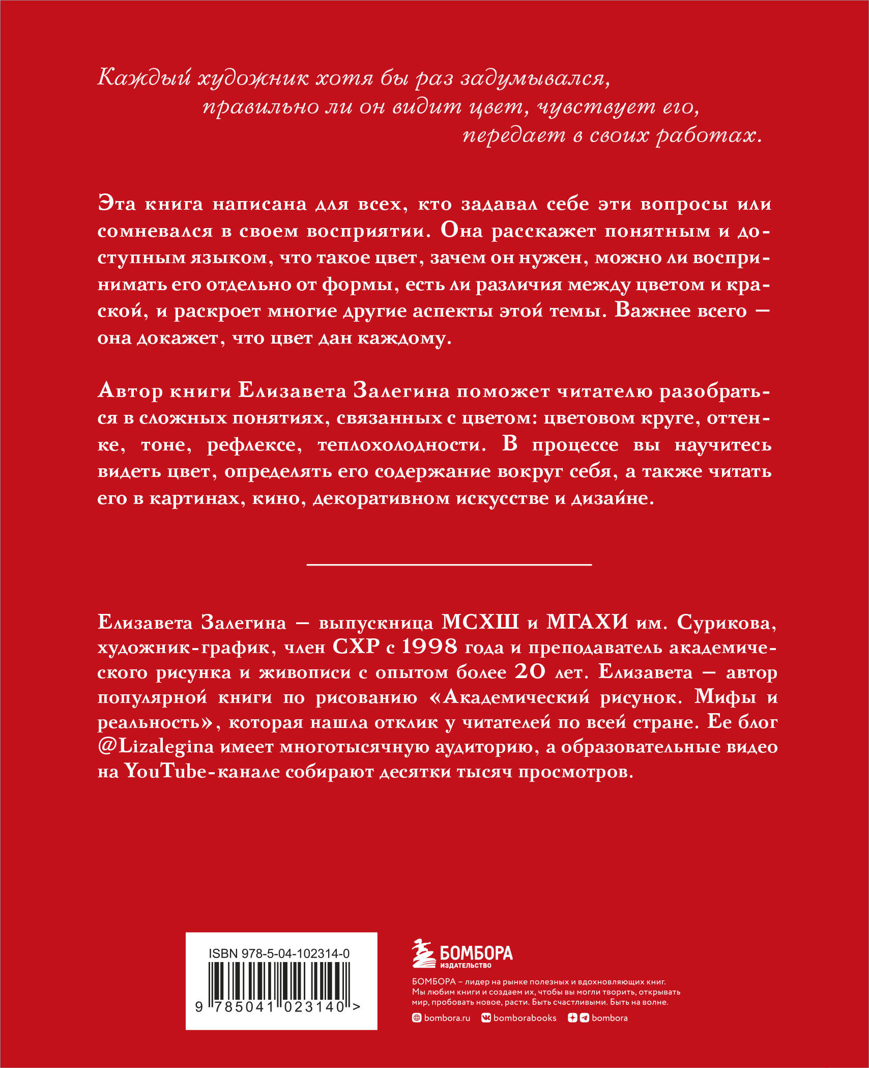 Что такое цвет? Почему каждый воспринимает его по-разному? Можно ли научиться его видеть и как с ним работать? В новой книге Елизаветы Залегиной собраны ответы на все вопросы, связанные с темой цвета. Книга расскажет, зачем нужен цвет, какие существуют распространенные заблуждения вокруг этого понятия, что такое теплохолодность и цветовой рефлекс, как свет и тень влияют на восприятие, что на самом деле можно назвать "грязью" на картине и можно ли. На ее страницах вы также найдете теорию цветового круга, объяснение эффекта Гете, а также "принципа якоря", которые помогут разобраться в сложной теме цвета. Автор книги Елизавета Залегина - выпускница МСХШ и МГАХИ им. Сурикова, художник-график, член СХР с 1998 года и преподаватель академического рисунка и живописи с опытом более 20 лет. Елизавета написала популярную книгу по рисованию "Академический рисунок. Мифы и реальность", которая нашла отклик у читателей по всей стране, а образовательные видео на YouTube-канале собирают десятки тысяч просмотров.| Издательство | 2a734e3d-a107-11de-8bc8-00265518a912 |