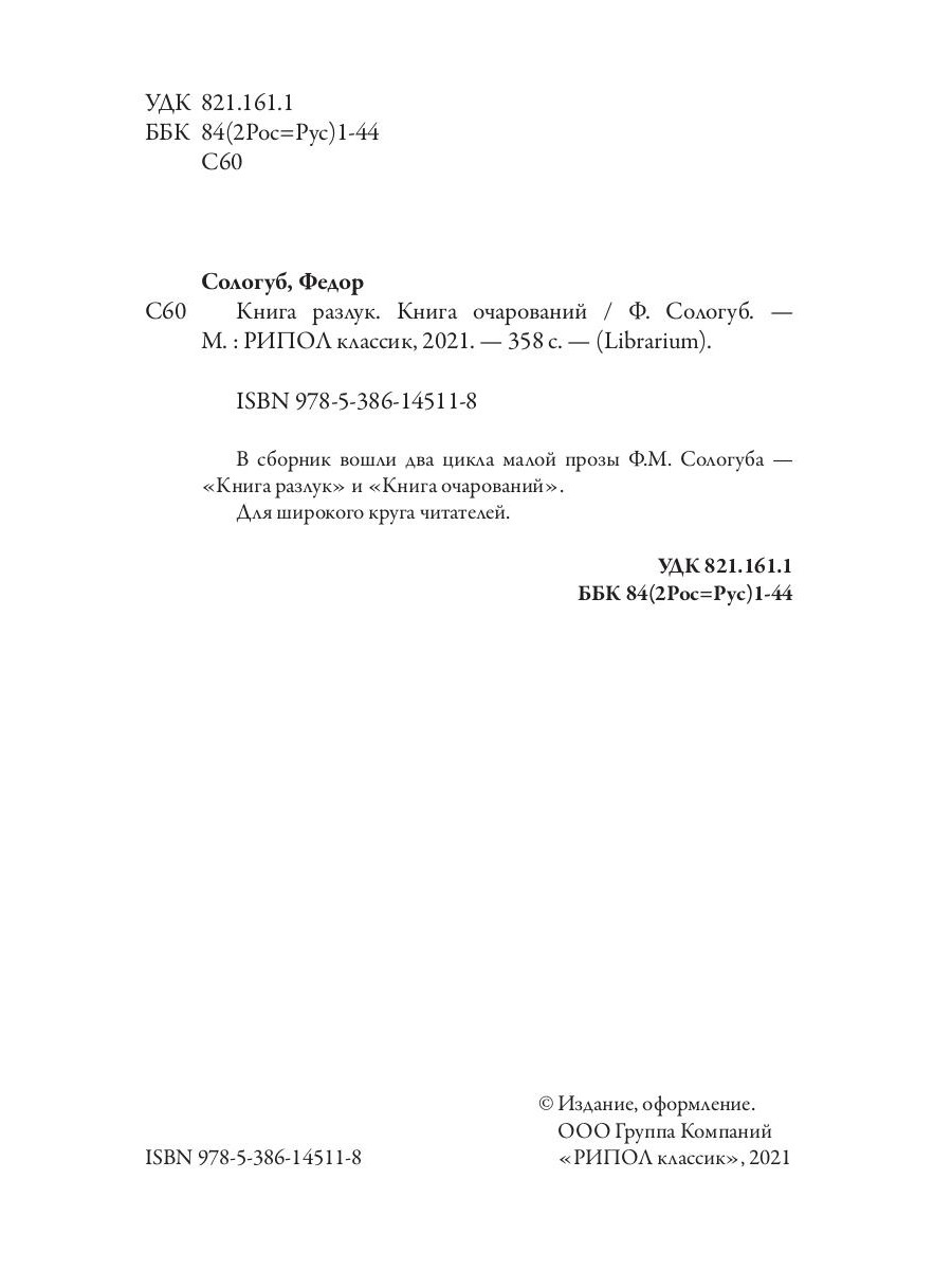 В сборник вошли два цикла малой прозы Ф.К. Сологуба «Книга разлук» и «Книга очарований». Для широкого круга читателей.| Издательство | Рипол Классик |