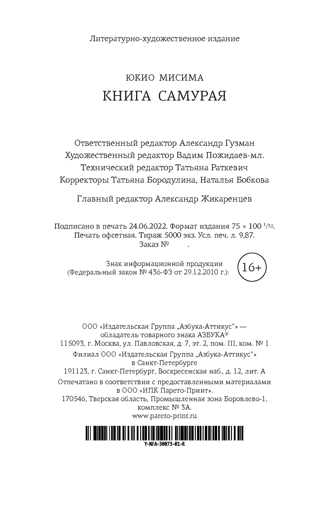 Юкио Мисима - самый знаменитый и читаемый в мире японский писатель. Прославился он в равной степени как своими произведениями во всех мыслимых жанрах (романы, пьесы, рассказы, эссе), так и экстравагантным стилем жизни и смерти (харакири после неудачной попытки монархического переворота). «Книга самурая» - это размышления Мисимы о «Хагакурэ, или Сокрытом в листве» - трактате о кодексе чести самурая (бусидо), выдержанном в канонах дзен-буддизма, синтоизма и конфуцианства и составленном на основе бесед с самураем XVII века Дзётё Ямамото. Эти истории о боевой доблести и воинском долге, совести и ответственности, записанные одним из учеников Дзётё, - не сборник заповедей, а оригинальная методика познания мира и постижения мудрости. «Возможно, "Хагакурэ" - изначально книга-парадокс, - пишет Мисима. - Во время войны она излучала свет, но средь белого дня он был не очень заметен, и лишь во мраке книга засияла по-настоящему. 〈…〉 Эта книга исповедует свободу. Эта книга взывает к жару сердец». Публикуется в переводе с японского - большинство предыдущих изданий «Книги самурая» по-русски брали за основу английский перевод.| Издательство | Азбука |