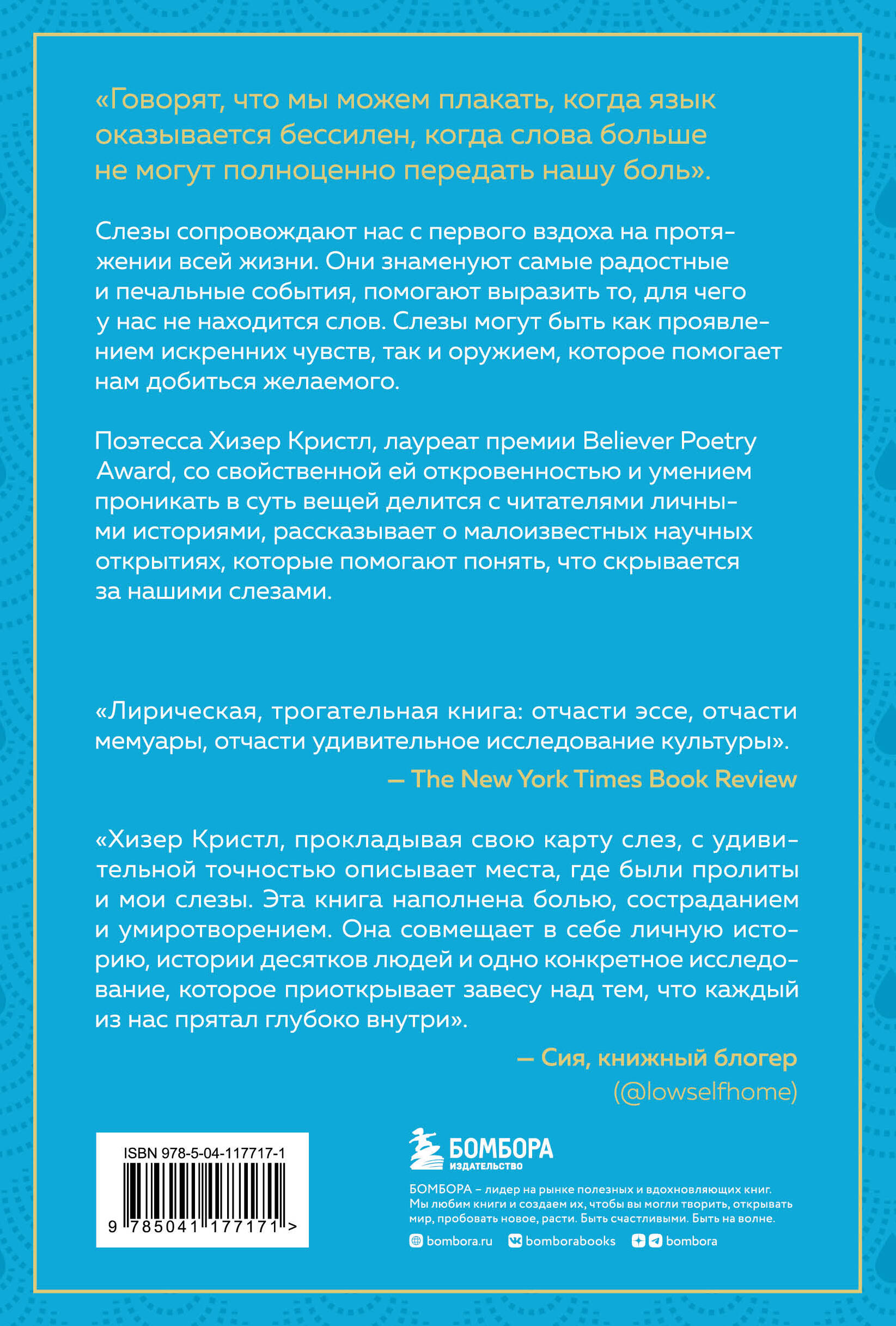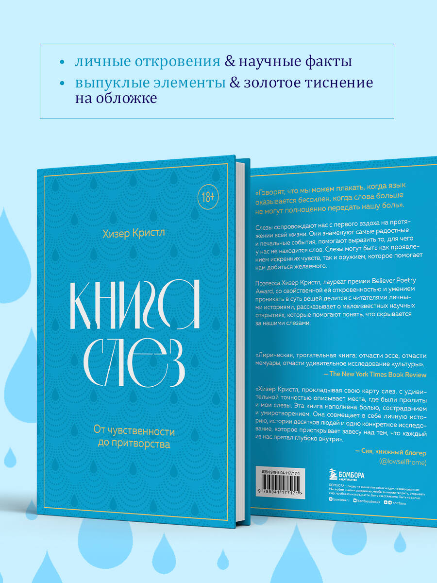 Слезы сопровождают нас с первого вздоха на протяжении всей жизни. Они знаменуют самые радостные и печальные события, помогают выразить то, для чего у нас не находится слов. Слезы могут быть как проявлением искренних чувств, так и оружием, которое помогает нам добиться желаемого. Поэтесса Хизер Кристл, лауреат премии Believer Poetry Award, со свойственной ей откровенностью и умением проникать в суть вещей, делится с читателями личными историями, рассказывает о малоизвестных научных открытиях, которые помогают понять, что скрывается за нашими слезами. ОТЗЫВЫ «Лирическая, трогательная книга: отчасти эссе, отчасти мемуары, отчасти удивительное исследование культуры». - The New York Times Book Review «Хизер Кристл, прокладывая свою карту слёз, с удивительной точностью описывает места, где были пролиты и мои слёзы. Эта книга наполнена болью, состраданием и умиротворением. Она совмещает в себе личную историю, истории десятков людей и одно конкретное исследование, которое приоткрывает завесу над тем, что каждый из нас прятал глубоко внутри». - Сия, книжный блогер (@lowselfhome)| Издательство | ООО "Издательство "Эксмо" |