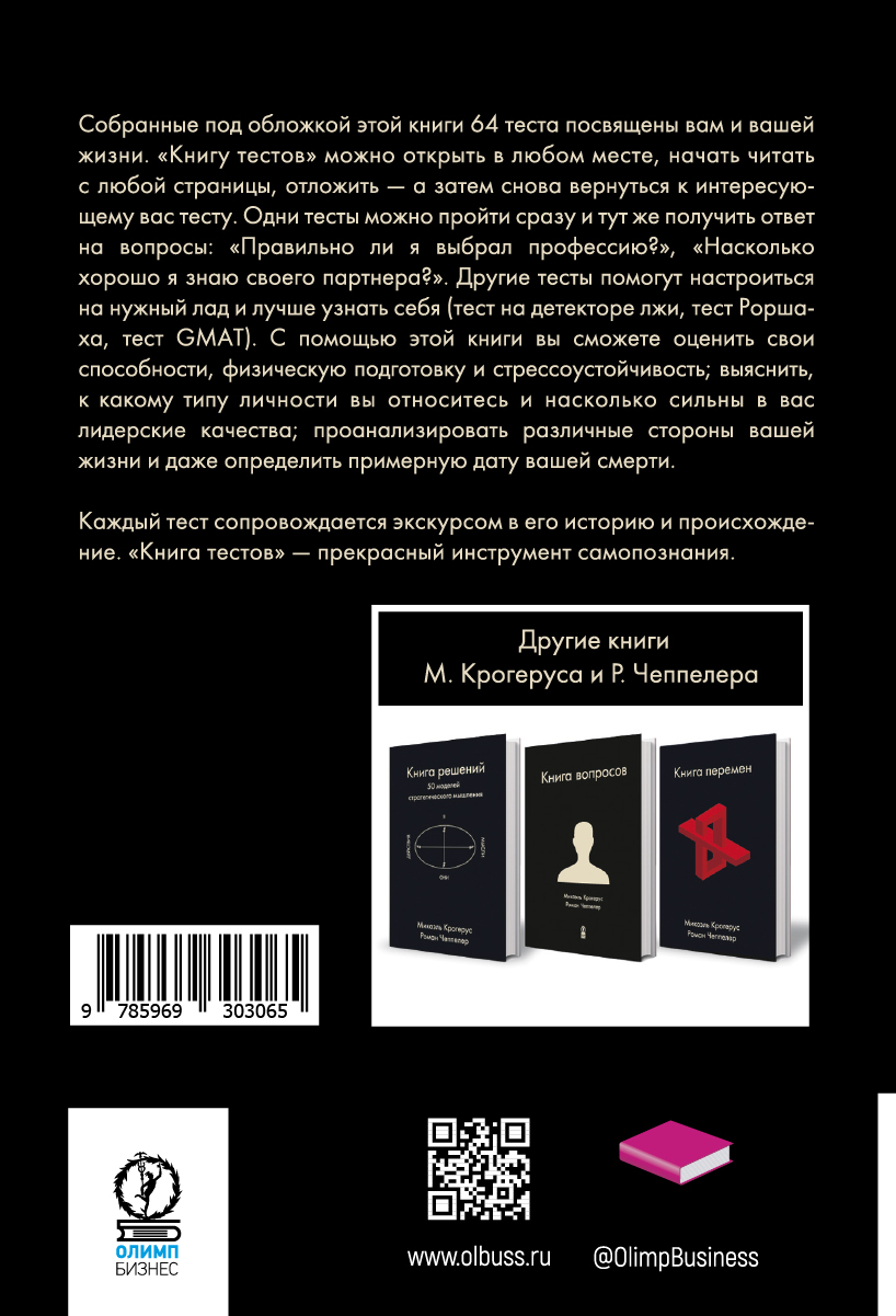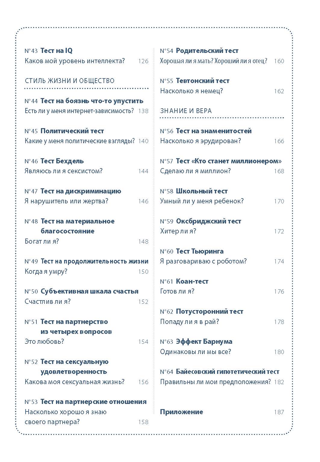 Собранные под обложкой этой книги 64 теста посвящены вам и вашей жизни. "Книгу тестов" можно открыть в любом месте, начать читать с любой страницы, отложить - а затем снова вернуться к интересующему вас тесту. Одни тесты можно пройти сразу и тут же получить ответ на вопросы: "Правильно ли я выбрал профессию?", "Насколько хорошо я знаю своего партнера?". Другие тесты помогут настроиться на нужный лад и лучше узнать себя (тест на детекторе лжи, тест Роршаха, тест GMAT). С помощью этой книги вы сможете оценить свои способности, физическую подготовку и стрессоустойчивость; выяснить, к какому типу личности вы относитесь и насколько сильны в вас лидерские качества; проанализировать различные стороны вашей жизни и даже определить примерную дату вашей смерти. Каждый тест сопровождается экскурсом в его историю и происхождение.