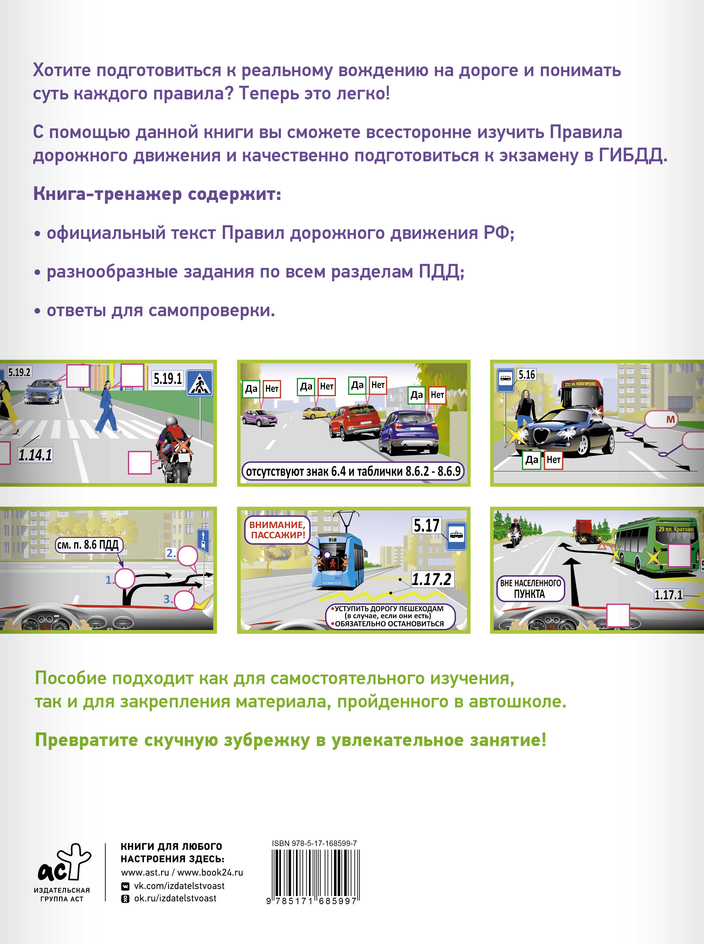 Хотите подготовиться к реальному вождению на дороге и понимать суть каждого правила? Теперь это легко! С помощью данной книги вы сможете всесторонне изучить Правила дорожного движения и качественно подготовиться к экзамену в ГИБДД. Тренажер содержит: - официальный текст Правил дорожного движения РФ; - разнообразные задания по разделам ПДД; - ответы для самопроверки. Пособие подходит как для самостоятельного изучения, так и для закрепления материала, пройденного в автошколе. Превратите скучную зубрежку в увлекательное занятие! Издание учитывает все изменения, опубликованные в официальных источниках на момент подписания издания в печать.| Издательство | Издательство "АСТ" |