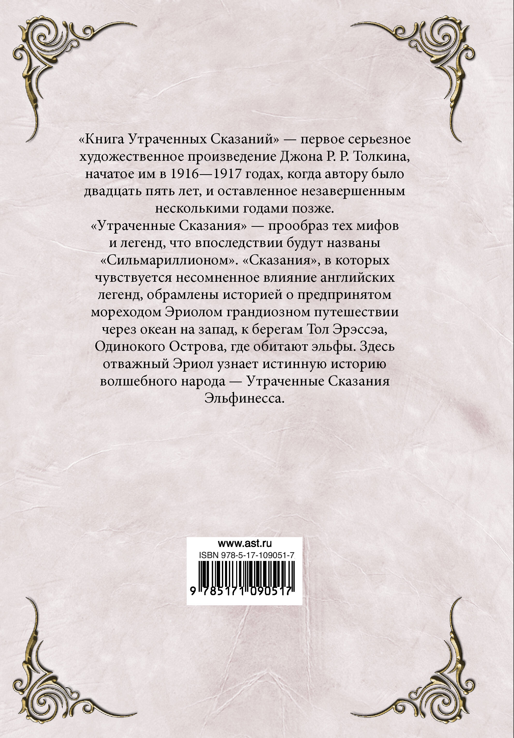 "Книга Утраченных Сказаний" - первое серьезное художественное произведе- ние Джона Р. Р. Толкина, начатое им в 1916-1917 годах, когда автору было двадцать пять лет, и оставленное незавершенным несколькими годами позже. "Утраченные Сказания" - прообраз тех мифов и легенд, что впоследствии будут названы "Силь- мариллионом". "Сказания", в которых чувствуется несомненное влияние английских легенд, обрамлены историей о предпринятом мореходом Эриолом грандиозном путе- шествии через океан на запад, к берегам Тол Эрэссэа, Одинокого Острова, где обита- ют эльфы. Здесь отважный Эриол узнает истинную историю волшебного народа - Утраченные Сказания Эльфинесса.| Издательство | Издательство "АСТ" |