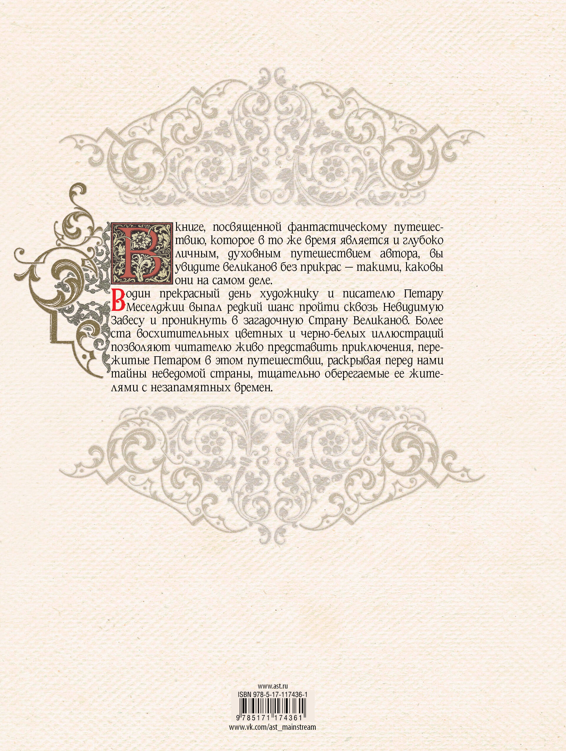 В книге, посвященной фантастическому путешествию, которое в то же время является и глубоко личным, духовным путешествием автора, вы увидите великанов без прикрас - такими, каковы они на самом деле. В один прекрасный день художнику и писателю Петару Меселджии выпал редкий шанс пройти сквозь Невидимую Завесу и проникнуть в загадочную Страну Великанов. Более ста восхитительных цветных и черно-белых иллюстраций позволяют читателю живо представить приключения, пережитые Петаром в этом путешествии, раскрывая перед нами тайны неведомой страны, тщательно оберегаемые ее жителями с незапамятных времен.| Издательство | ИЗДАТЕЛЬСТВО "АСТ" |