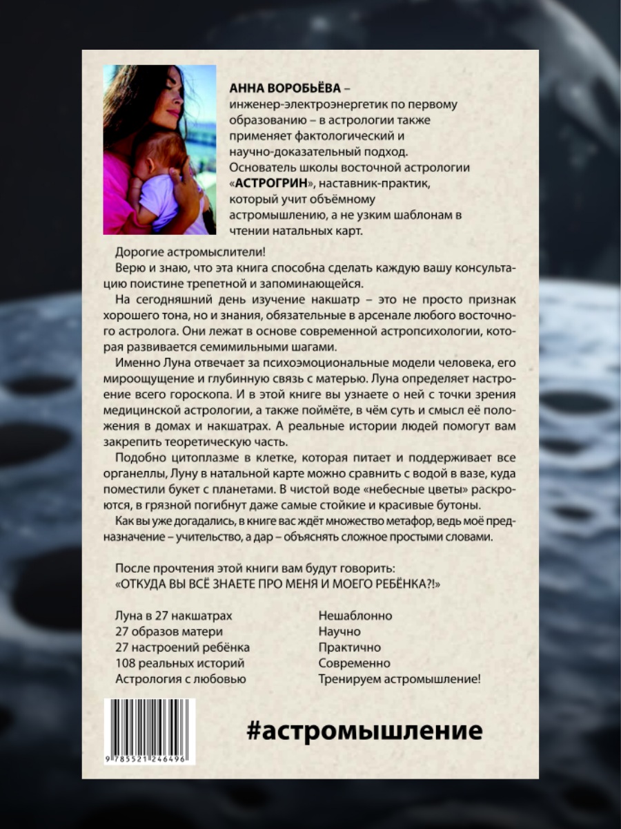 Вы станете свидетелем честного и тёплого разговора о Луне, написанного с любовью к астрологии и уважением к человеку. Сможете прокачать своё астромышление и заполучить навигатор по эмоциональным ландшафтам детско-родительских отношений, с сотнями ориентиров, реальных историй и тонких авторских наблюдений.