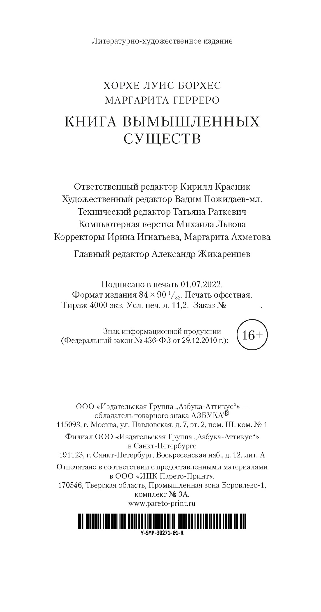 Хорхе Луис Борхес - один из самых популярных писателей ХХ века, во многом определивший облик современной литературы. Известна его склонность ко всевозможным антологиям, энциклопедиям и бестиариям. «Это таинственная любовь ко всему, существующему без нас», - писал он в стихотворении «При покупке энциклопедии». В 1950 году Борхес в соавторстве с Маргаритой Герреро выпустил «Учебник по фантастической зоологии», который после неоднократных дополнений обрел свое окончательное воплощение под названием «Книга вымышленных существ». Читатель найдет здесь множество странных, удивительных созданий, пришедших со страниц старинных книг и рожденных в воображении поэтов и философов, включая самого Борхеса. При этом книга построена в излюбленном стиле автора, когда граница между поэзией и прозой, вымыслом и реальностью истончается и исчезает, оставляя читателя лицом к лицу с подлинной литературой. В настоящее издание вошла наиболее полная версия «Книги вымышленных существ», подготовленная Борхесом на английском языке в 1974 году и послужившая источником вдохновения для многих писателей, поэтов и художников.| Издательство | Азбука |