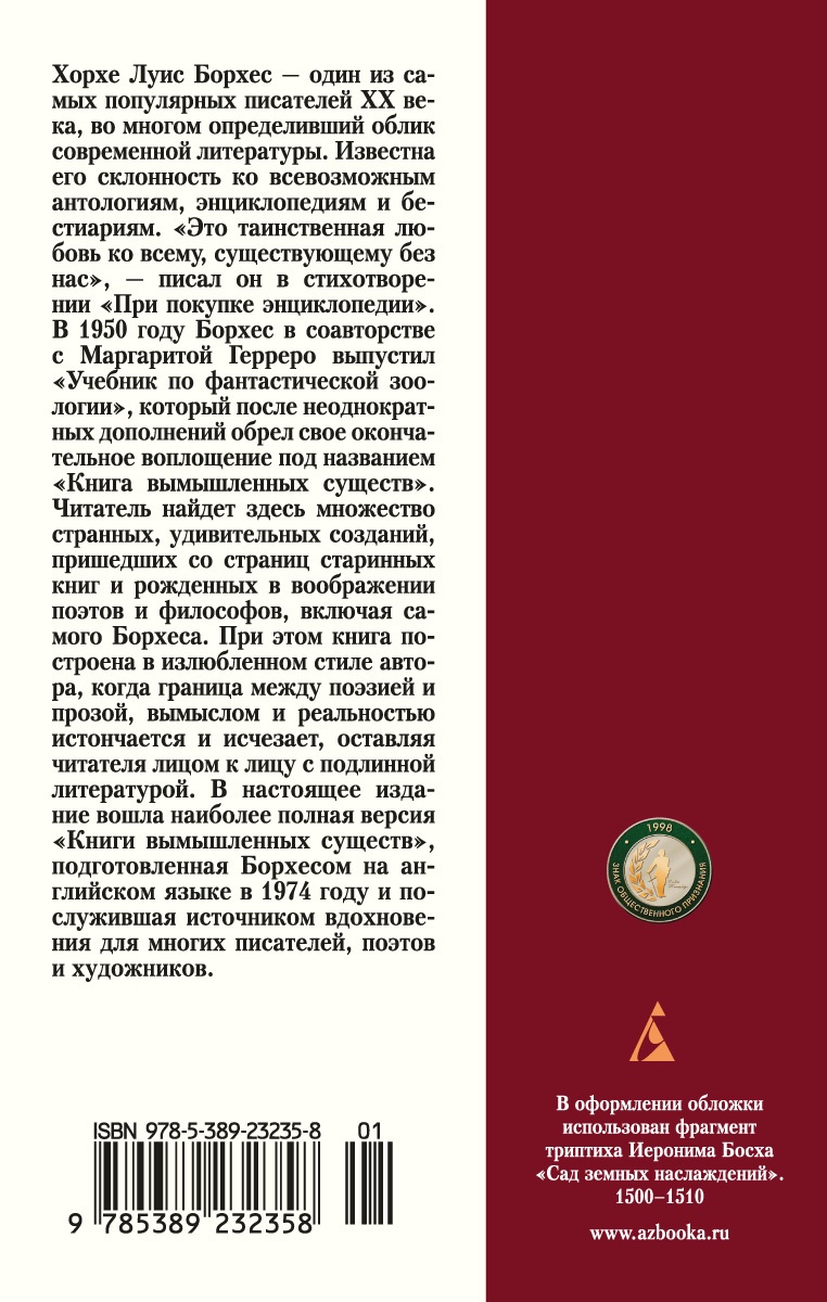 Хорхе Луис Борхес - один из самых популярных писателей ХХ века, во многом определивший облик современной литературы. Известна его склонность ко всевозможным антологиям, энциклопедиям и бестиариям. «Это таинственная любовь ко всему, существующему без нас», - писал он в стихотворении «При покупке энциклопедии». В 1950 году Борхес в соавторстве с Маргаритой Герреро выпустил «Учебник по фантастической зоологии», который после неоднократных дополнений обрел свое окончательное воплощение под названием «Книга вымышленных существ». Читатель найдет здесь множество странных, удивительных созданий, пришедших со страниц старинных книг и рожденных в воображении поэтов и философов, включая самого Борхеса. При этом книга построена в излюбленном стиле автора, когда граница между поэзией и прозой, вымыслом и реальностью истончается и исчезает, оставляя читателя лицом к лицу с подлинной литературой. В настоящее издание вошла наиболее полная версия «Книги вымышленных существ», подготовленная Борхесом на английском языке в 1974 году и послужившая источником вдохновения для многих писателей, поэтов и художников.| Издательство | Азбука |