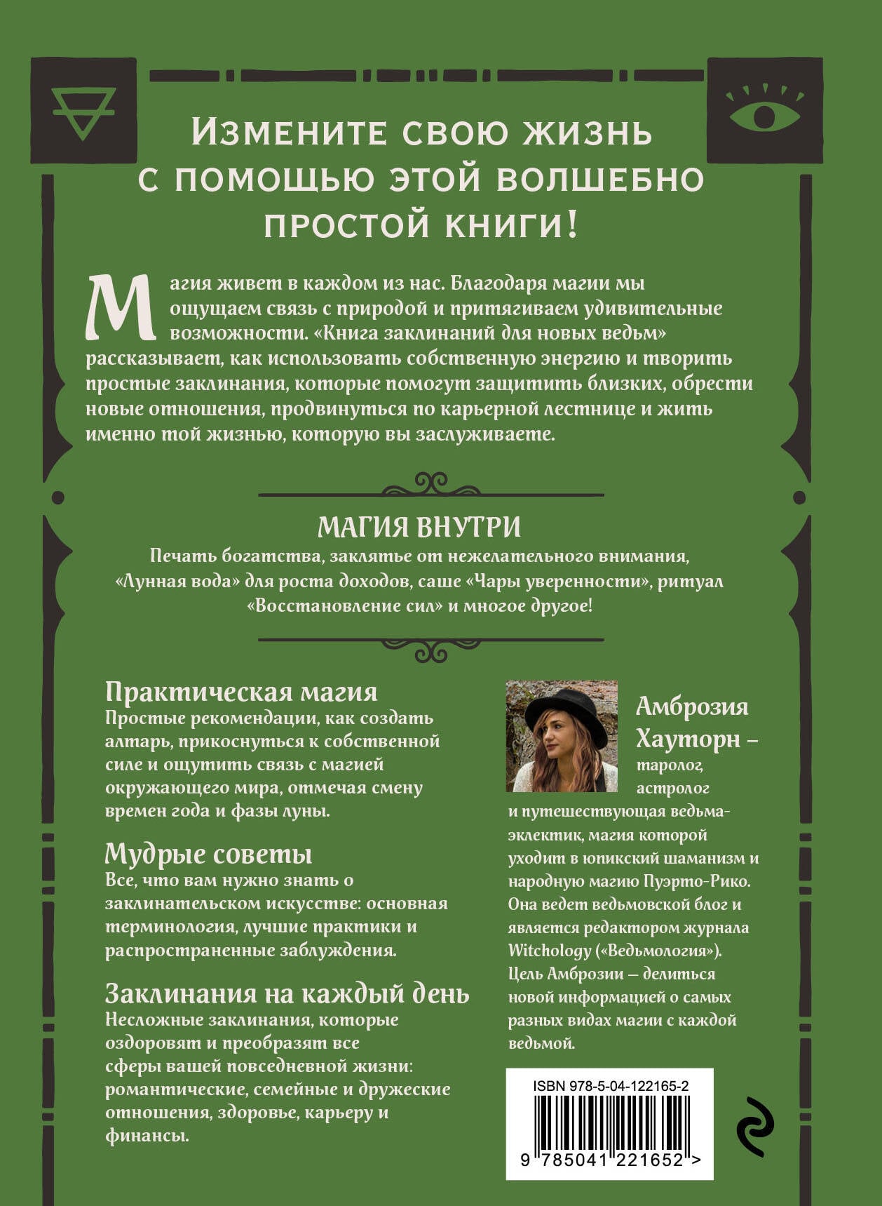 Измените свою жизнь с помощью этой волшебно простой книги, которая покорила мир, стала супербестселлером Amazon и собрала более 10 000 отзывов! Магия живет в каждом из нас. Благодаря магии мы ощущаем связь с природой и притягиваем удивительные возможности. «Книга заклинаний для современной ведьмы» рассказывает, как использовать собственную энергию и творить простые заклинания, которые помогут защитить близких, обрести новые отношения, продвинуться по карьерной лестнице и жить именно той жизнью, которую вы заслуживаете. В ней вы найдете 130 простых заклинаний, основанных на викканских практиках, среди которых: печать богатства, заклятие от нежелательного внимания, «Лунная вода» для роста доходов, саше «Чары уверенности», ритуал «Восстановление сил» и многое другое! В «Книге заклинаний для новых ведьм» вас ждут: • Практическая магия: простые рекомендации, как создать алтарь, прикоснуться к собственной силе и ощутить связь с магией окружающего мира, отмечая смену времен года и фазы луны. • Мудрые советы: все, что вам нужно знать о заклинательском искусстве: основная терминология, лучшие практики и распространенные заблуждения. • Заклинания на каждый день: несложные заклинания, которые оздоровят и преобразят все сферы вашей повседневной жизни: романтические, семейные и дружеские отношения, здоровье, карьеру и финансы. Амброзия Хауторн - таролог, астролог и путешествующая ведьма-эклектик, магия которой уходит в юпикский шаманизм и народную магию Пуэрто-Рико. Она ведет ведьмовской блог и является редактором журнала Witchology («Ведьмология»). Цель Амброзии - делиться новой информацией о самых разных видах магии с каждой ведьмой.