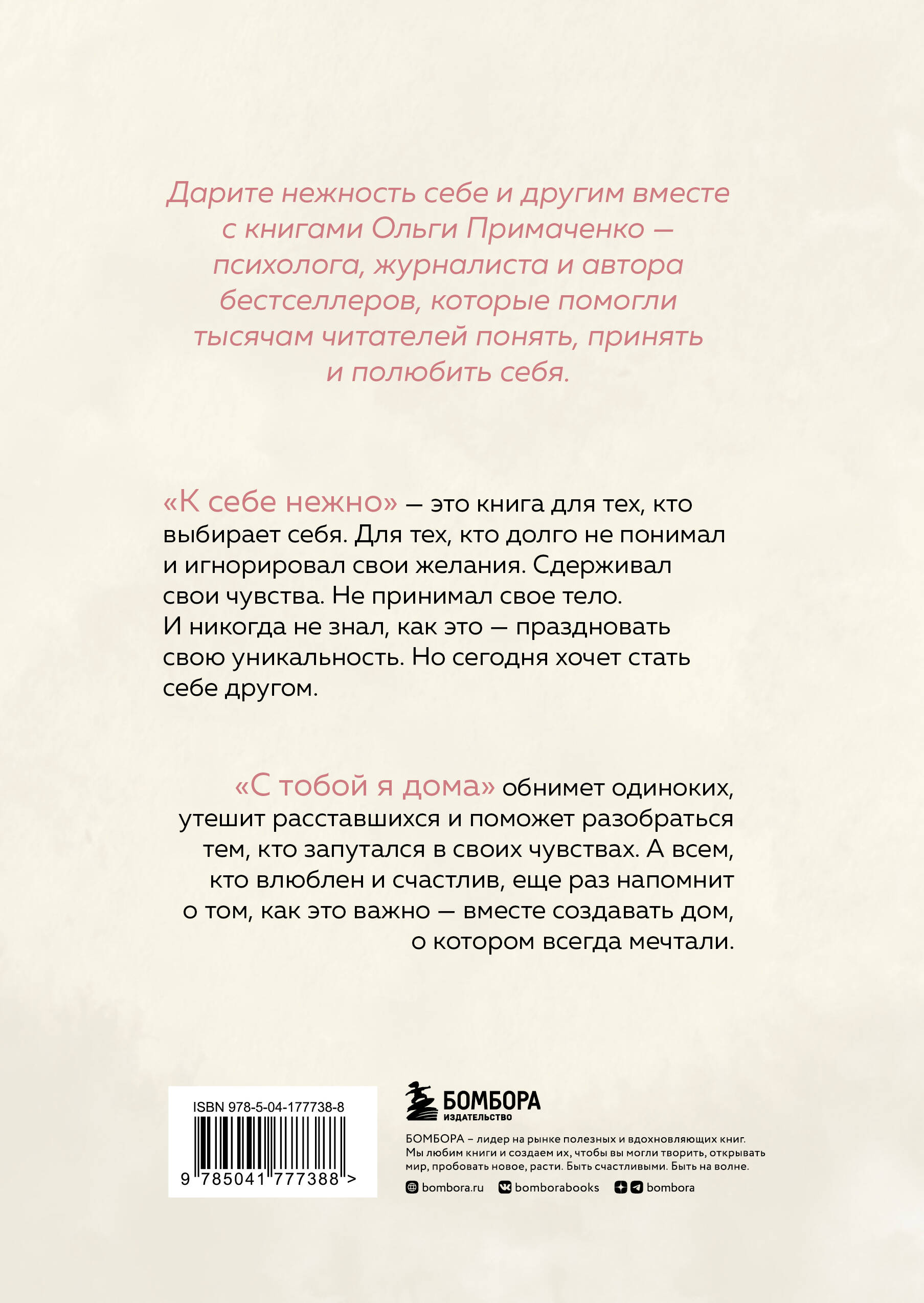 Дарите нежность себе и другим вместе с книгами Ольги Примаченко, - психолога, журналиста и автора бестселлеров, которые помогли тысячам читателей понять, принять и полюбить себя. «К себе нежно» - это книга для тех, кто выбирает себя. Для тех, кто долго не понимал и игнорировал свои желания. Сдерживал свои чувства. Не принимал свое тело. И никогда не знал, как это - праздновать свою уникальность. Но сегодня хочет стать себе другом. «С тобой я дома» обнимет одиноких, утешит расставшихся и поможет разобраться тем, кто запутался в своих чувствах. А всем, кто влюблен и счастлив, еще раз напомнит, как это важно - вместе создавать дом, о котором всегда мечтали. Автор этих книг Ольга Примаченко - экс-главный редактор LADY.TUT.BY и автор блога Gnezdo.by - говорит с читателем о важном: о принятии своих чувств, желаний и тела, о расставлении приоритетов и границ, о создании питательного пространства вокруг себя, а также об экологичном взаимодействии с миром и людьми.
