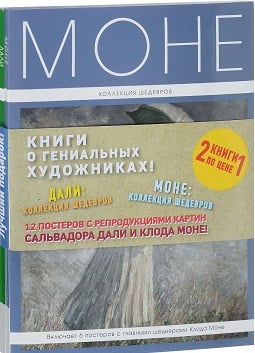 Книга 1<br>Моне. Коллекция шедевров (+ 6 постеров).<br>Эта книга поведает о судьбе великого художника, в которой были как светлые, так и печальные страницы, о том, как он и его сподвижники, не получив признания академического искусства, создали свое собственное направление, перевернувшее историю живописи, и о том, как Клод Моне стал легендой уже при жизни.<br>Также издание включает галерею самых прекрасных картин художника, расскажет о музеях, где его можно увидеть, и о книгах, посвященных знаменитому импрессионисту.<br>Вместе с книгой в подарочный футляр вложены шесть постеров (20 см х 25 см) с шедеврами Моне.<br>Книга 2<br>Дали. Коллекция шедевров (+ 6 постеров).<br>Сальвадор Дали - настоящий человек-оркестр. Его наследие включает великолепные картины, остроумные романы, эксцентричные костюмы и ювелирные украшения, изящные скульптуры. Эта книга продемонстрирует все грани таланта великого сюрреалиста, но прежде всего он предстанет как один из самых ярких и талантливых живописцев XX века. Издание включает биографию художника, в том числе подробно освещает его непростые взаимоотношения с музой Галой и с художественной группировкой сюрреалистов. Также оно расскажет о том, насколько оригинально Дали воспринимал современное ему общество и события, происходившие в мире и в его родной Испании, о его творческих исканиях и внутренних конфликтах на протяжении всей долгой жизни.<br>Книга включает галерею гениальных шедевров художника и такую полезную информацию, как список музеев, где можно увидеть его картины, и книг, посвященных выдающемуся сюрреалисту.<br>Альбом упакован в подарочную папку, в которую также вложено 6 постеров (20 см х 25 см) со знаменитыми шедеврами Сальвадора Дали.