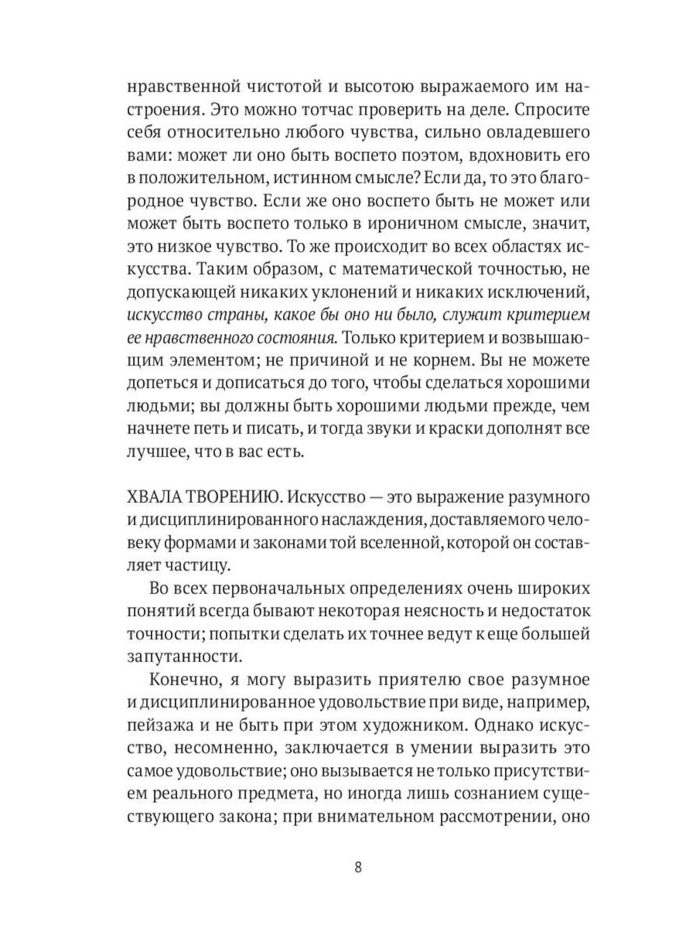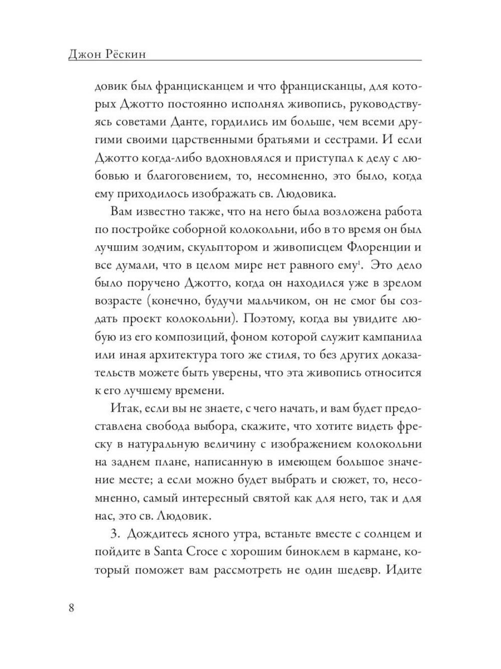 Комплект состоит из трех книг Джона Рёскина: «Прогулки по Флоренции» написаны Джоном Рёскиным в 1877 году. Путеводитель по Флоренции, с ее, как позднее напишет И. Бродский «архитектурой рая», представляет собой не шесть глав -«шесть утр». «Дождитесь ясного утра, - пишет Рёскин, - встаньте вместе с солнцем и пойдите в Santa Croce с хорошим биноклем в кармане, который поможет вам рассмотреть не один шедевр». Сегодняшнему читателю не составит труда найти в интернете какое-либо большое произведение искусства Ренессанса в мельчайших подробностях, но чтобы проникнуть в его суть, необходим проводник. Эрудит, обаятельный рассказчик и поэт Рёскин проведет читателя по знаковым памятникам Флоренции, подскажет лучший ракурс для обзора, снабдит необходимыми цитатами из Данте, историческими фактами, а главное, пробудит в нем желание увлеченно исследовать искусство эпохи Возрождения. «Сезам и лилии» Английский писатель, художник, философ и теоретик искусства Джон Рёскин (1819-1900) был одним из первых, кто на заре развития искусствознания предложил новый взгляд на природу и сущность художественного творчества, показав его глубокую взаимосвязь со всей человеческой культурой. Эта эстетическая программа получила непосредственное выражение в цикле лекций, составивших книгу «Сезам и лилии». Опираясь на классические произведения Данте, Мильтона, Шекспира, автор рассуждает о губительном материализме современного ему общества, необходимости воспитания чувства прекрасного, неразрывно сопряженного с этикой, а также о важнейшей роли женщин в этом процессе. «Теория красоты» - глубокое эстетическое исследование, посвященное природе красоты и ее восприятия. Джон Рёскин, один из основоположников современного искусствознания, призывает к целостному пониманию красоты - как феномена не только материального, но и духовного, неразрывно связанного с этическими аспектами жизни. Именно как отражение гармонии мира, истины и добра красота обитает в природе и обретает свое воплощение в искусстве. С этой точки зрения в трактате рассматриваются различные художественные формы - архитектура, живопись, ремесло, являющиеся своеобразным зеркалом морального состояния общества. Подлинные произведения, исполненные нравственной чистоты и гармонии, противопоставляются автором поверхностному блеску современной урбанистической культуры. Концепция красоты Рёскина стала одной из ключевых в эстетической философии XIX века и оказала значительное влияние на последующие поколения художников, архитекторов и философов.| Издательство | Т8 RUGRAM |