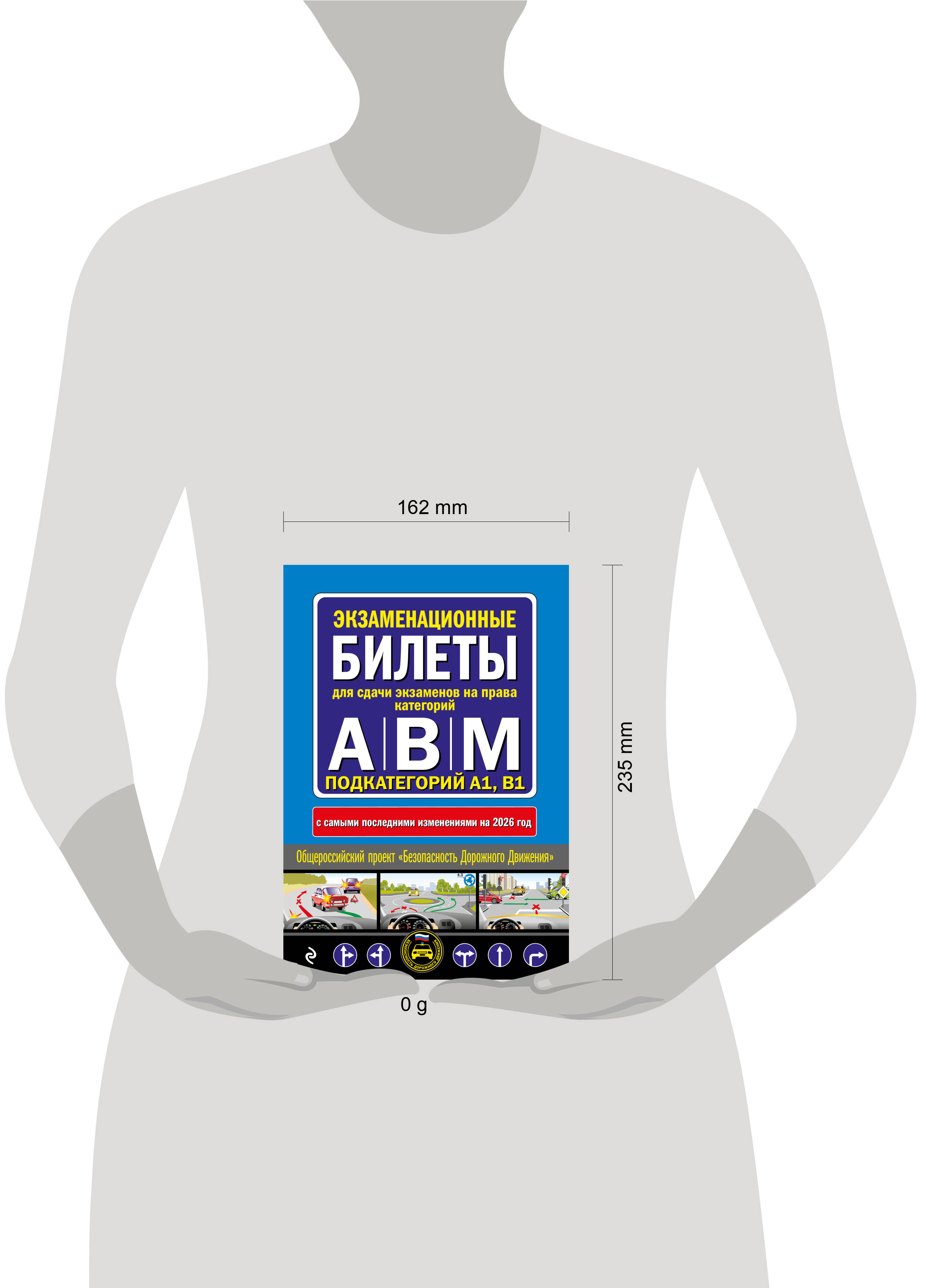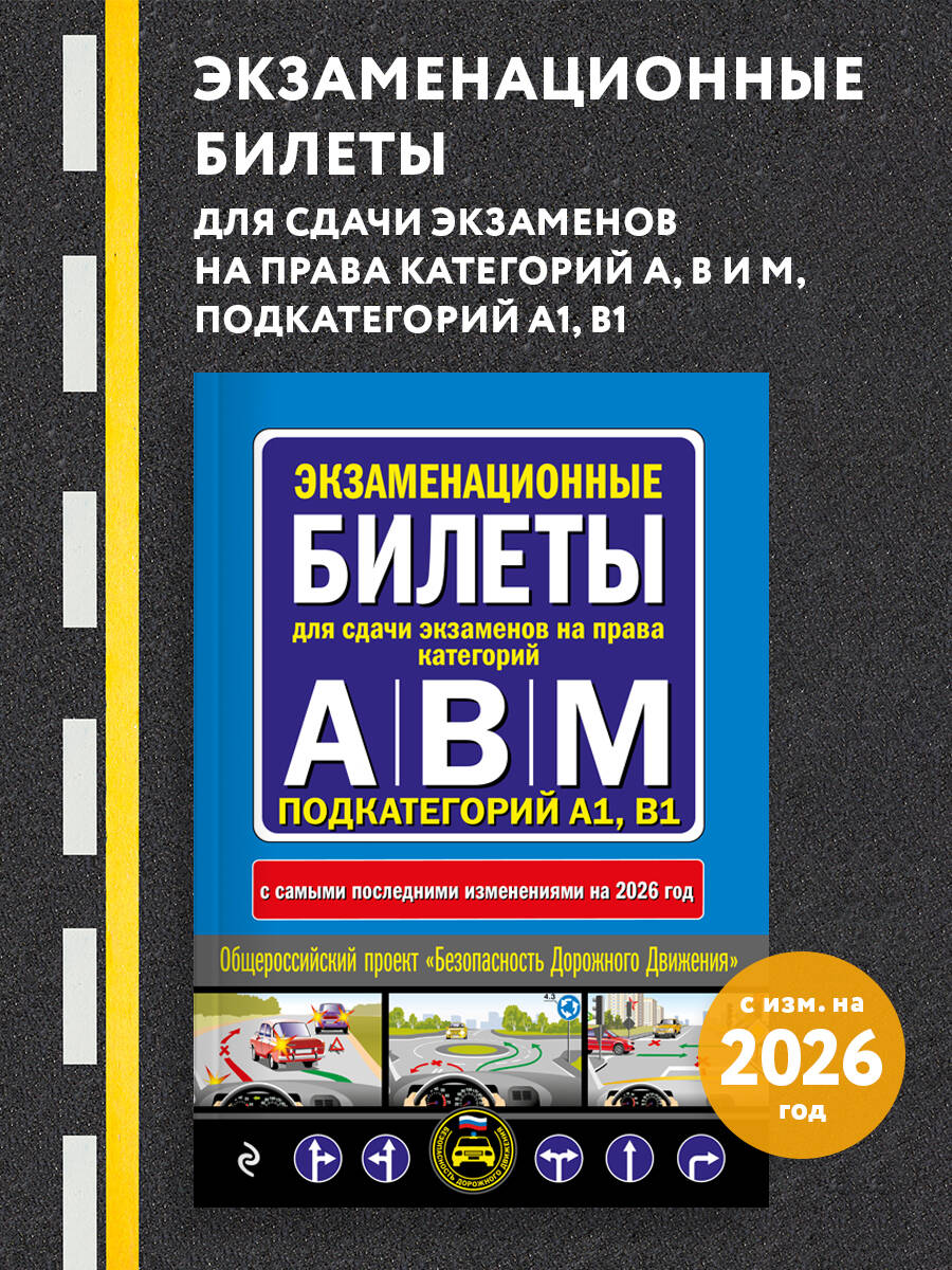 Аннотация: Экзаменационные билеты для сдачи экзаменов на права категорий А, В и M, подкатегорий A1, B1 (с изм. на 2026 год)