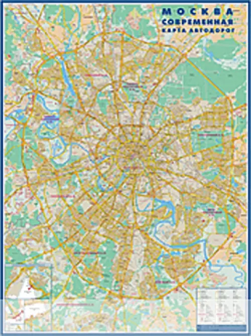 Настенная карта автодорог Москвы. Размер 1,18х1,58 м, ламинированная, высококачественная полиграфия, отпечатана в Италии, актуальная информация. Схема административного деления, границы и подписи районов и округов Москвы. Показаны развязки, строящиеся дороги, ж/д переезды, улицы с ограничением движения, реверсивное движение, выделенные полосы, АЗС, АГЗС, светофоры, пешеходные улицы и зоны, управления ГИБДД, посты ДПС, перехватывающие парковки.