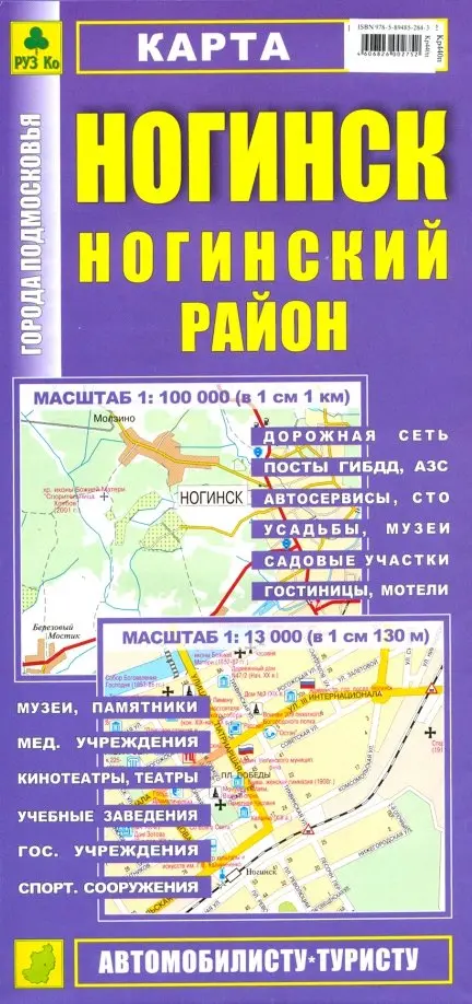 Двусторонняя подробная карта всего района с указанием класса дорог и расстояний между населенными пунктами в километрах. Указано расположение постов ГИБДД, автозаправочных станций. Имеется указатель населенных пунктов. Масштаб 1:100 000. Кроме этого карта содержит подробный план города со всеми улицами, номерами угловых домов. Указано расположение административных зданий и социально-культурных объектов. Масштаб: Ногинск 1:13 000. Формат 495х695 мм.