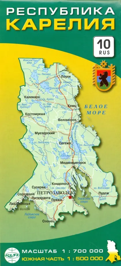 Удобное расположение территории - вся Карелия на одном листе карты, с обратной стороны - южная часть республики в увеличенном масштабе. Показаны границы Республики Карелия и ее административных районов, отмечены районные центры. Населённые пункты даны в соответствии с количеством жителей; указаны автомобильные дороги, их номера и технологическое состояние, железные дороги, расстояния между отдельными участками автодорог, элементы природы и рельефа. Показаны территории государственных заповедников, национальных парков и заказников федерального значения; отмечены речные и морские порты, аэропорты, международные автомобильные пункты пропуска, объекты культуры и сервиса, основные достопримечательности. Масштаб: 1:700 000 (Республика Карелия), 1:500 000 (южная часть)