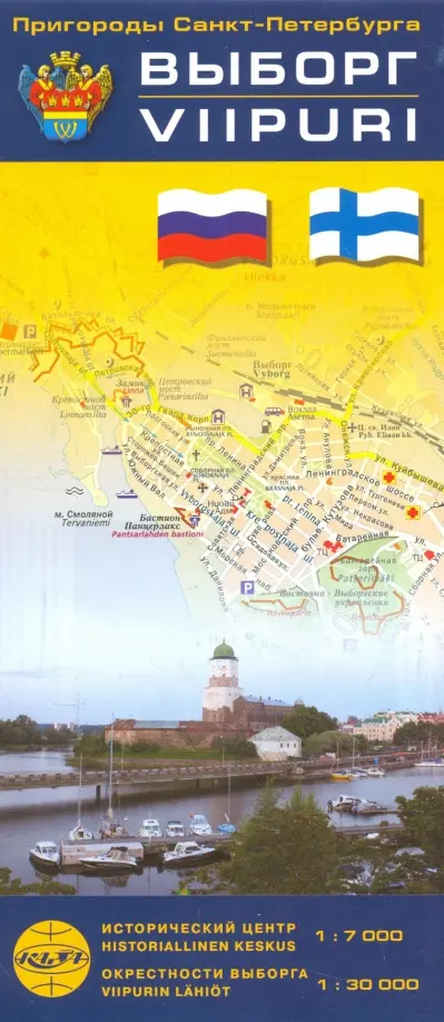 На карте Выборга отмечены памятники архитектуры, исторические укрепления, музеи, храмы, памятники, кафе, пристани, гостиницы, таможенные и пограничные службы, информация для водителей. Дополнительно: время работы музеев, информация о гостиницах, транспорт из Санкт-Петербурга, календарь фестивалей и праздников, указатель улиц. Одновременно на русском и финском языках. Формат: 100х225 мм. Формат разворота: 690x450 мм. Масштаб: город - 1:7 000; окрестности - 1:30 000