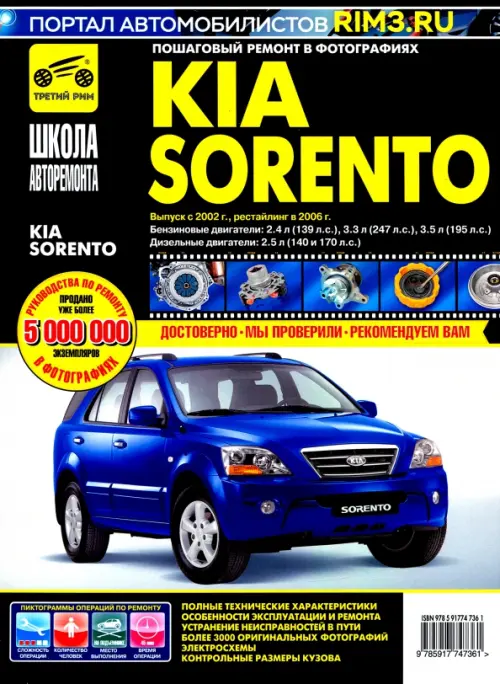 Предлагаем вашему вниманию руководство по ремонту и эксплуатации автомобилей Kia Sorento выпуска с 2002 г. , рестайлинг в 2006 г. , с бензиновыми двигателями 2,4 л (139 л. с. ), 3,3 л (247 л. с. ) и 3,5 л (195 л. с. ) и с дизельными двигателями 2,5 л (140 и 170 л. с. ), автоматической или механической коробкой передач. В издании подробно рассмотрено устройство автомобиля, даны рекомендации по эксплуатации и ремонту. Специальный раздел посвящен неисправностям в пути, способам их диагностики и устранения. Все подразделы, в которых описаны обслуживание и ремонт агрегатов и систем, содержат перечни возможных неисправностей и рекомендации по их устранению, а также указания по разборке, сборке, регулировке и ремонту узлов и систем автомобиля с использованием стандартного набора инструментов в условиях гаража. Операции по регулировке, разборке, сборке и ремонту автомобиля снабжены пиктограммами, характеризующими сложность работы, число исполнителей, место проведения работы и время, необходимое для ее выполнения. Указания по разборке, сборке, регулировке и ремонту узлов и систем автомобиля с использованием готовых запасных частей и агрегатов приведены пооперационно и подробно иллюстрированы фотографиями и рисунками, благодаря которым даже начинающий автолюбитель легко разберется в ремонтных операциях. Структурно все ремонтные работы разделены по системам и агрегатам, на которых они проводятся (начиная с двигателя и заканчивая кузовом). По мере необходимости операции снабжены предупреждениями и полезными советами на основе практики опытных автомобилистов. Структура книги составлена так, что фотографии или рисунки без порядкового номера являются графическим дополнением к последующим пунктам. При описании работ, которые включают в себя промежуточные операции, последние указаны в виде ссылок на подраздел и страницу, где они подробно описаны. В приложениях содержатся необходимые для эксплуатации, обслуживания и ремонта сведения о моментах затяжки резьбовых соединений, эксплуатационных жидкостях, применяемых лампах и свечах зажигания, контрольные размеры кузова. В конце книги приведены цветные электросхемы. Книга предназначена для автолюбителей и специалистов СТО. Kia Sorento с 2002 г. / 2006 г. , бенз. дв. 2.4; 3.3; 3.5; диз. дв. 2.5; ч/б фото, рук. по рем. Школа Авторемонта//с 2002 г. / 2006 г. //