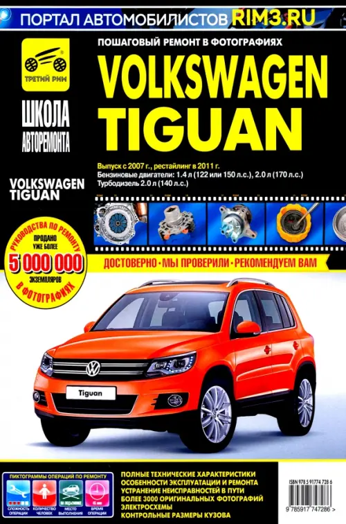 Предлагаем вашему вниманию руководство по ремонту и эксплуатации автомобилей Volkswagen Tiguan выпуска с 2007 г. , рестайлинг в 2011 г. , с бензиновыми двигателями 1,4 л (122 или 150 л. с. ), 2,0 л (170 л. с. ) и турбодизелем 2,0 л (140 л. с. ). В издании подробно рассмотрено устройство автомобиля, даны рекомендации по эксплуатации и ремонту. Специальный раздел посвящен неисправностям в пути, способам их диагностики и устранения. Все подразделы, в которых описаны обслуживание и ремонт агрегатов и систем, содержат перечни возможных неисправностей и рекомендации по их устранению, а также указания по разборке, сборке, регулировке и ремонту узлов и систем автомобиля с использованием стандартного набора инструментов в условиях гаража. Операции по регулировке, разборке, сборке и ремонту автомобиля снабжены пиктограммами, характеризующими сложность работы, число исполнителей, место проведения работы и время, необходимое для ее выполнения. Указания по разборке, сборке, регулировке и ремонту узлов и систем автомобиля с использованием готовых запасных частей и агрегатов приведены пооперационно и подробно иллюстрированы фотографиями и рисунками, благодаря которым даже начинающий автолюбитель легко разберется в ремонтных операциях. Структурно все ремонтные работы разделены по системам и агрегатам, на которых они проводятся (начиная с двигателя и заканчивая кузовом). По мере необходимости операции снабжены предупреждениями и полезными советами на основе практики опытных автомобилистов. Структура книги составлена так, что фотографии или рисунки без порядкового номера являются графическим дополнением к последующим пунктам. При описании работ, которые включают в себя промежуточные операции, последние указаны 8 виде ссылок на подраздел и страницу, где они подробно описаны. В приложениях содержатся необходимые для эксплуатации, обслуживания и ремонта сведения о моментах затяжки резьбовых соединений, лампах и свечах зажигания, применяемых горюче-смазочных материалах, специальных жидкостях и их заправочные объемы, а также контрольные размеры кузова. В конце книги приведены цветные электросхемы. Книга предназначена для автолюбителей и специалистов СТО.