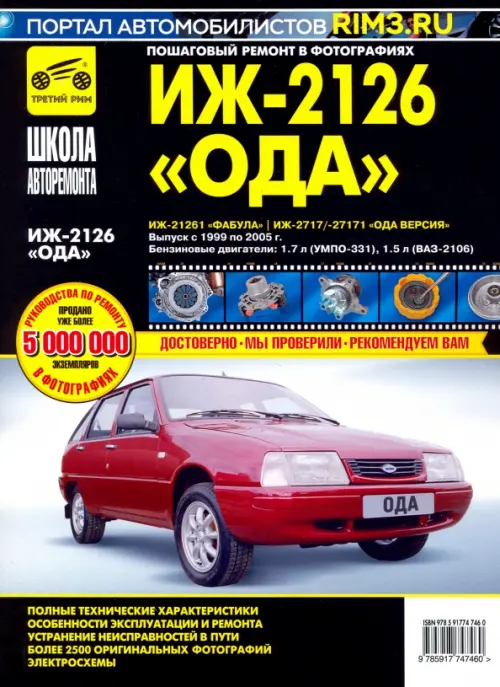 ИЖ 2126-261, 2717-171 с 1999-2005 гг. , бенз. дв. 1.5; 1.7; ч/б фото, рук. по рем. Школа Авторемонта//с 1999-2005 гг. Вниманию читателей предлагается руководство по ремонту и эксплуатации автомобилей Иж-2126 "Ода", Иж-21261 "Фабула", Иж-2717/-27171 "Ода Версия", оснащенных бензиновыми двигателями рабочим объемом 1,5 и 1,7 л. Руководство иллюстрировано подробными фотографиями, отображающими поэтапный процесс ремонта, благодаря которым даже начинающий автовладелец без труда разберется в ремонтных операциях. Даны перечни возможных неисправностей и рекомендации по их устранению, а также указания по разборке, сборке, регулировке и ремонту узлов и систем автомобиля с использованием готовых запасных частей и агрегатов. Способы ремонта подобраны в расчете на использование стандартных инструментов в условиях гаража, а фотоматериалы подготовлены в процессе разборки и сборки автомобилей высококвалифицированными автомеханиками. В процессе описания ремонтных операций даны полезные советы, составленные на основе практики опытных автомобилистов. Структура книга составлена так, что фотографии или рисунки, не имеющие порядкового номера, являются графическим дополнением к последующим пунктам. Книга может быть полезна всем автомобилистам, выполняющим ремонт автомобиля своими силами.