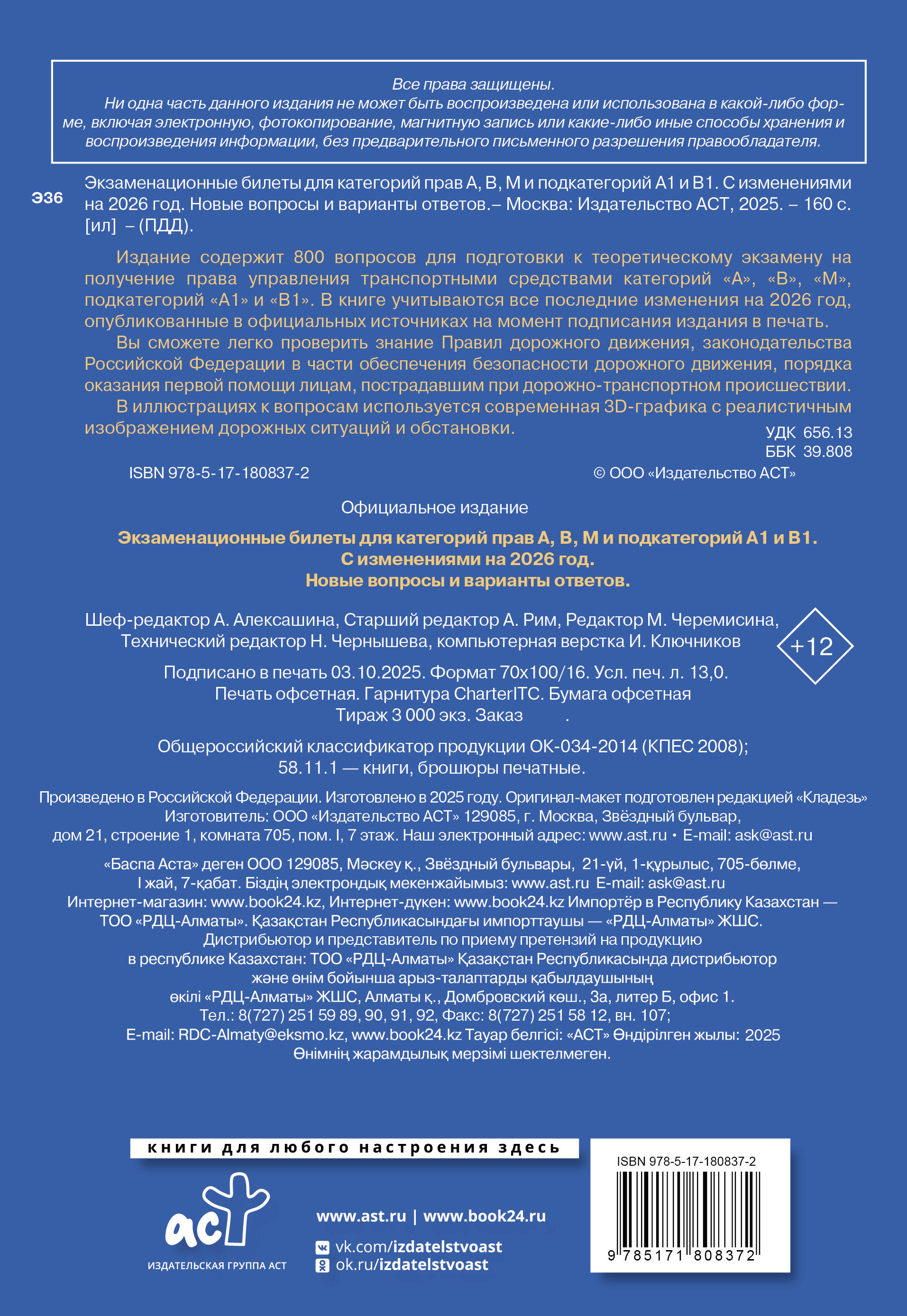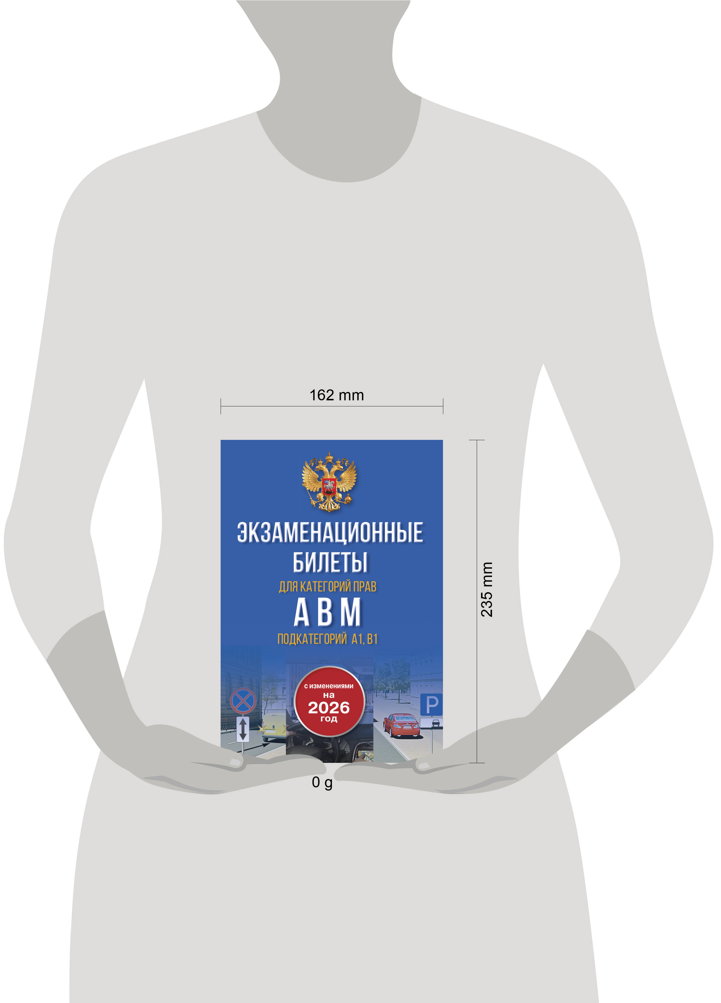 Аннотация: Экзаменационные билеты для категорий прав А, В, М и подкатегорий А1 и В1. С изменениями на 2026 год. Новые вопросы и варианты ответов