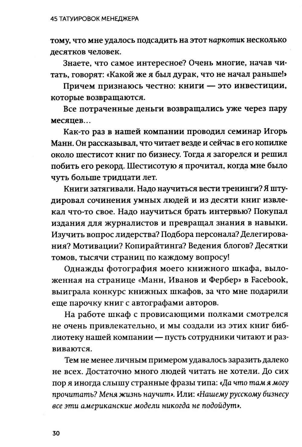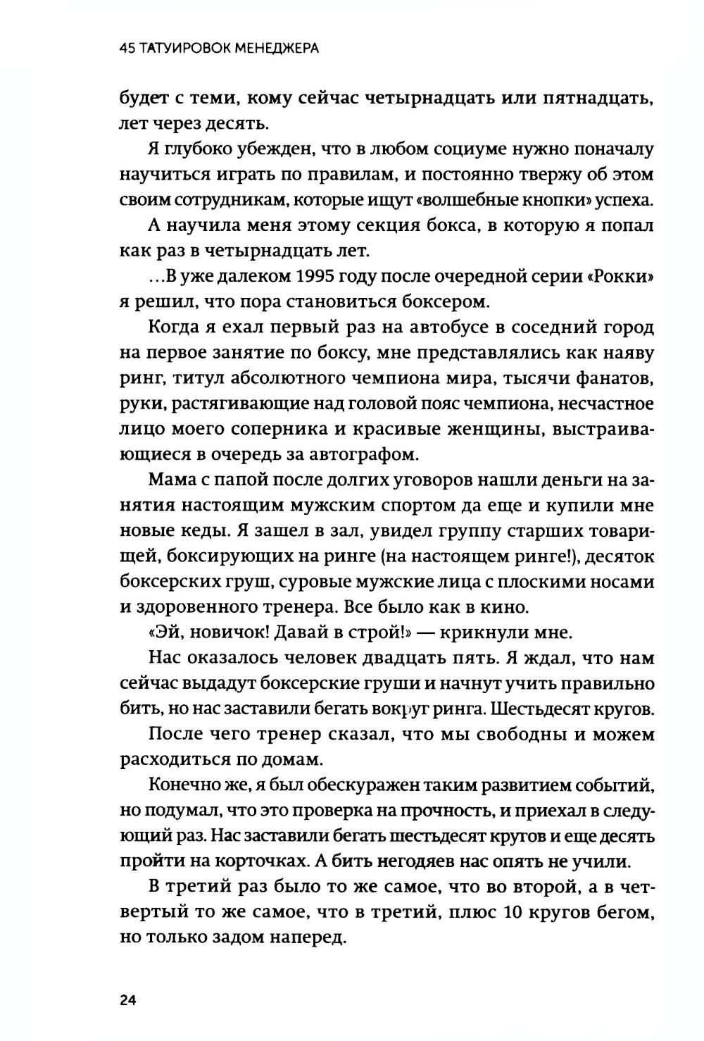 Татуировка - это надпись на всю жизнь. Важная надпись. Названия глав в этой книге - татуировки, оставшиеся в памяти и сердце менеджера, его житейский и организаторский опыт. Это правила о том, как относиться к коллегам, каким образом действовать в определенных ситуациях: свод принципов, которым стоит следовать, если хочешь добиться успеха. Почему? Потому что за каждой главой стоят осмысленные действия, чья-то боль, мучения, радости, удачный и неудачный опыт, подъемы и падения, увольнения и лидерство, а главное - нужный результат.