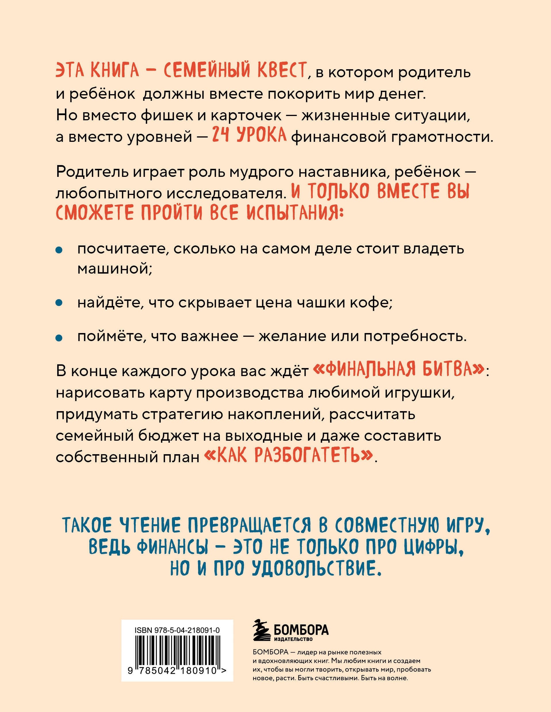 Эта книга - семейный квест, в котором родитель и ребенок должны вместе покорить мир денег. Но вместо фишек и карточек - жизненные ситуации, а вместо уровней - 24 урока финансовой грамотности. Родитель играет роль мудрого наставника, ребенок - любопытного исследователя. И только вместе вы сможете пройти все испытания: - посчитать, сколько на самом деле стоит владеть машиной; - найти, что скрывает цена чашки кофе; - понять, что важнее - желание или потребность. В конце каждого урока вас ждет «финальная битва»: нарисовать карту производства любимой игрушки, придумать стратегию накоплений, рассчитать семейный бюджет на выходные и даже составить собственный план «как разбогатеть». Такое чтение превращается в совместную игру, ведь финансы - это не только про цифры, но и про удовольствие.| Издательство | ООО "Издательство "Эксмо" |
