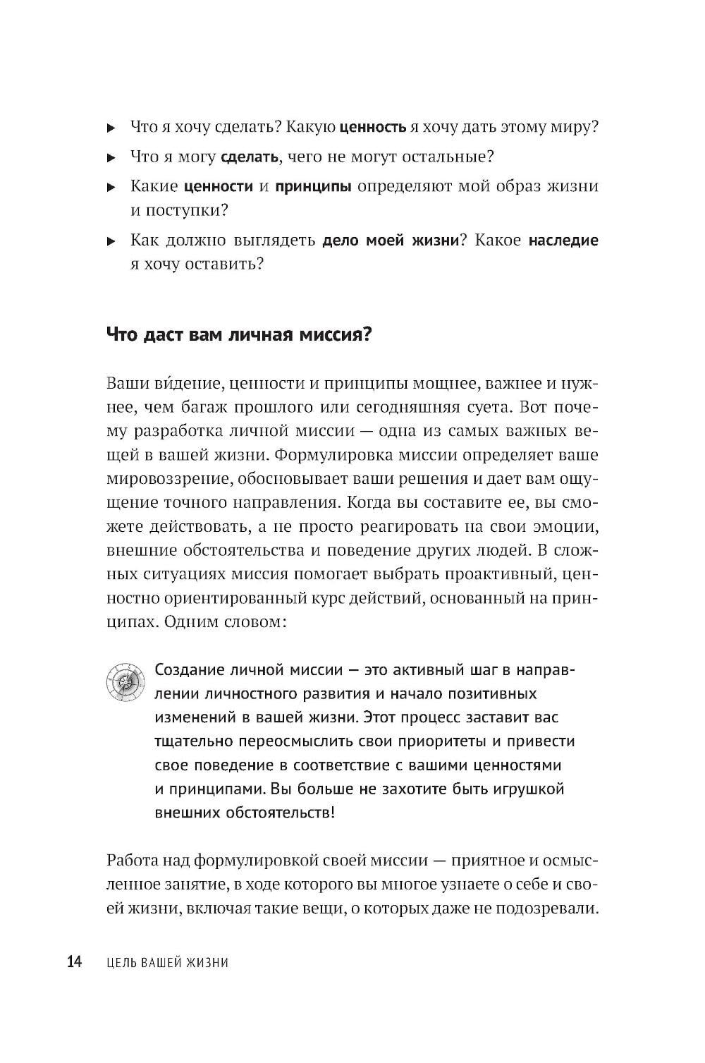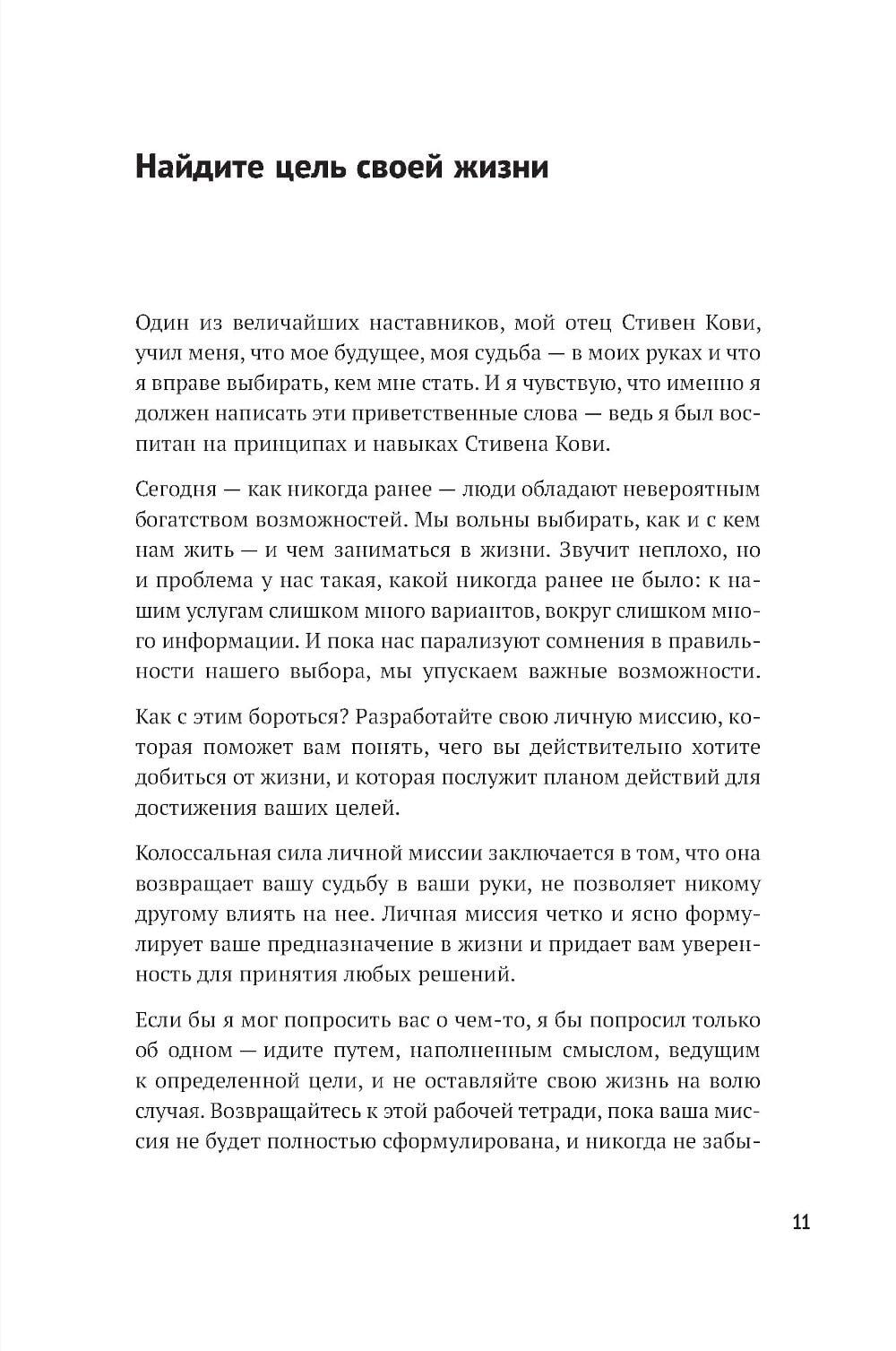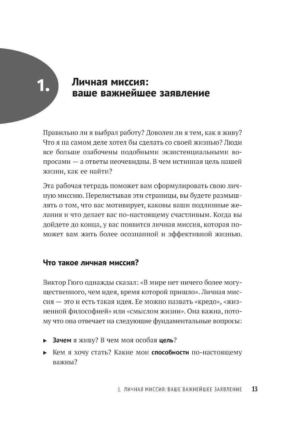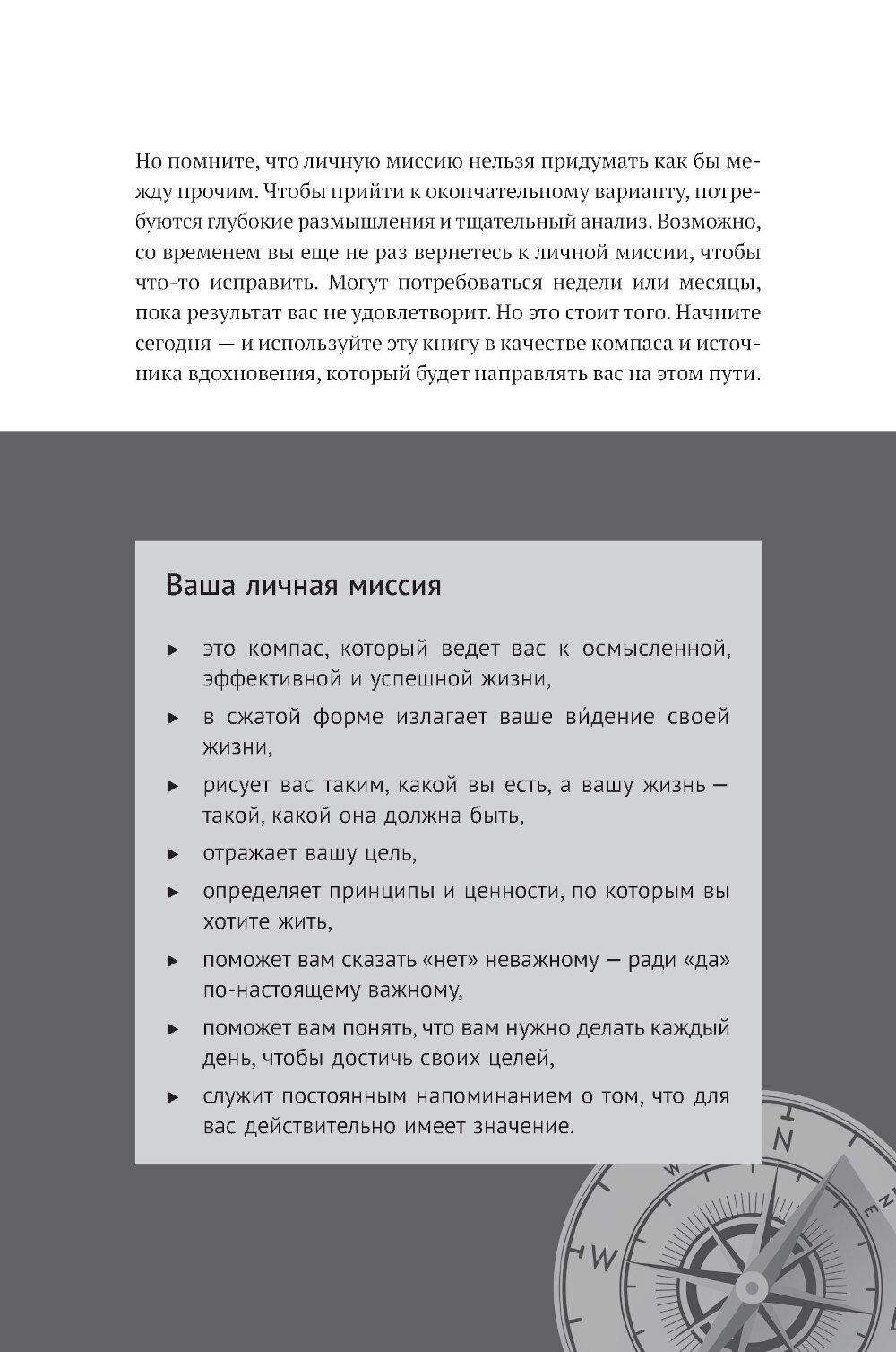 Вы когда-нибудь задавали себе вопрос, чего действительно хотите? Ответив на него, вы станете на путь к личной миссии - вашему предназначению, главной жизненной цели, компасу, который возвращает на выбранный курс, как бы далеко вы ни отклонились. Личная миссия придает уверенности, помогает найти занятие по душе и делает каждый ваш день на земле осмысленным. Это буквально самое главное, с чем должен определиться человек, который не желает отдаваться воле случая, - в этом убежден Стивен Р. Кови, автор «Семи навыков высокоэффективных людей» и других бестселлеров. Он предлагает практическое руководство, которое поможет определить ваше мировоззрение, раскрыть свой потенциал и сформулировать личную миссию - именно вашу, а не чью-то еще.