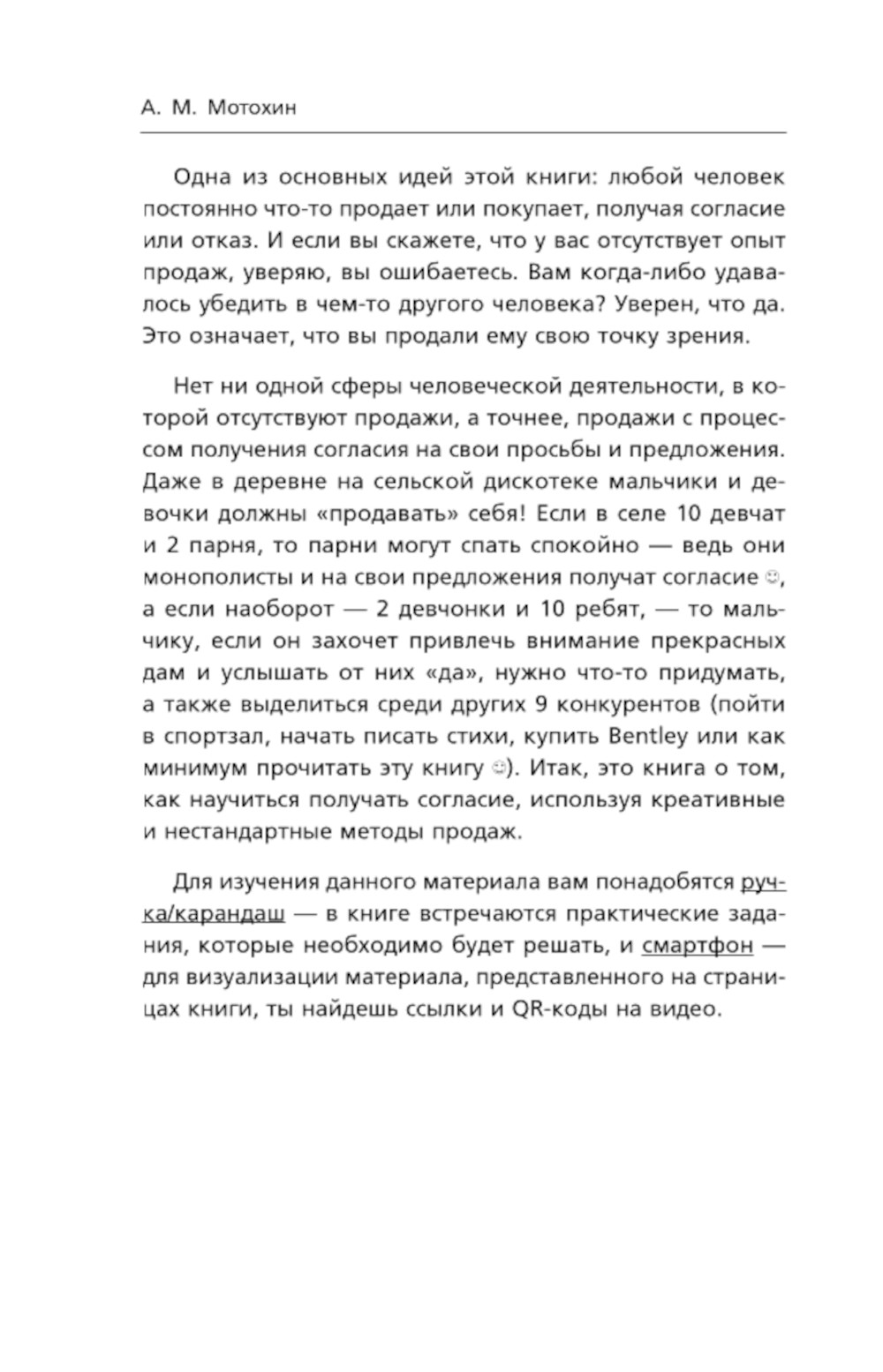 Антон Мотохин - кандидат экономических наук, имеет степень МВА. Будучи руководителем в БЭК-офисе и имея за спиной переход в должность руководителя отдела продаж, автор убежден, что продажам можно научиться легко. Иногда есть 1000 причин, по которым сделка невозможна. Но любые «нет» можно превратить в «да», если знать нужные приемы воздействия на людей. Люди постоянно продают или покупают, получая согласие или отказ. И если вам когда-либо удавалось убедить в чем-то другого человека, то поздравляю, вы продали ему свою точку зрения. Автор описывает и разбирает кейсы, методы и уловки продавцов из разных сфер повседневной жизни, которые обеспечивали им «Да». Итак, это книга о том, как научиться получать согласие, используя креативные и нестандартные методы продаж.| Издательство | Эксмо |